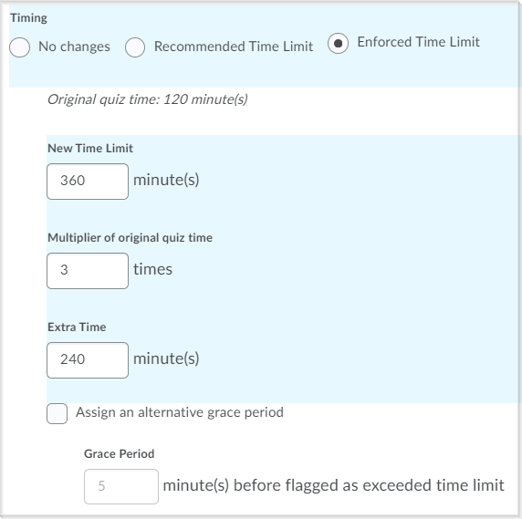 Note: After extending the learners quiz time by way of quiz time multipliers or +minutes on the Special Access page, if an instructor updates the duration of the quiz, the learner’s quiz time on the Special Access page does not dynamically update at this time.