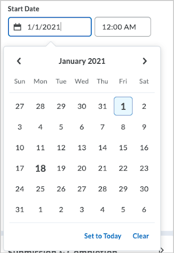 Note: There may be some instances of the older date picker remaining in Brightspace Learning Environment. These instances will be changed to the new date picker in a future release.