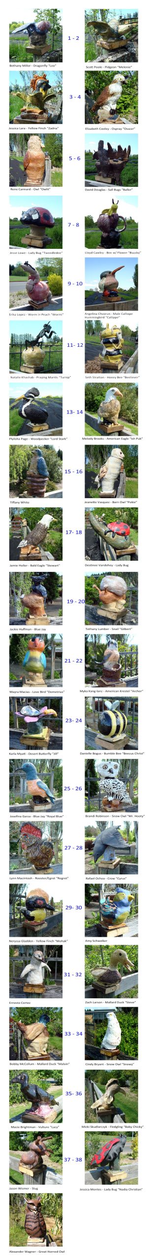 Fence post finials project. 40 students from two classes made ceramic birds and bugs inspired by those critters who hang out in the gardens of the Northwest. Each piece began with a uniform template for the base. From there, students were able to interpret their bird or bug of the Northwest in their own unique and playful manner.