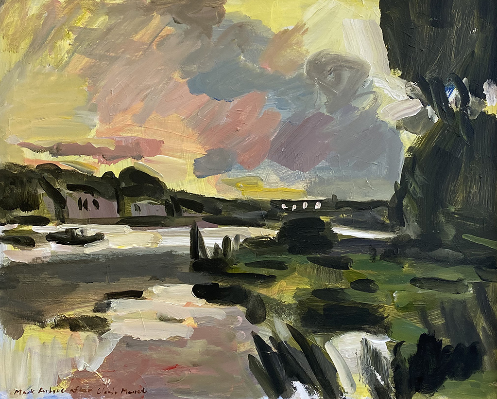 This painting is a version of Claude Monet's painting The Seine at Bougival in the Evening (1867) in the collection of the Smith College Museum of Art (Northampton, MA) where Andres lived in the late 1980's and knew this work. This version was painted for his students.
