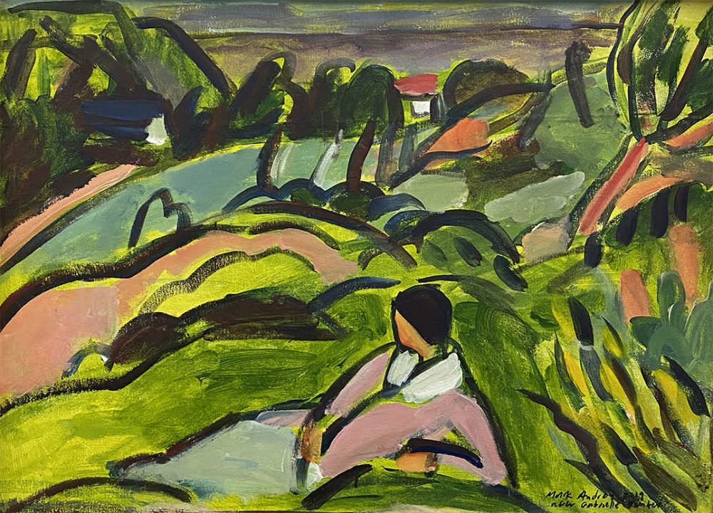 This is a version of a painting by Gabrielle Münter, Landscape by the Sea (1919) painted in Germany near Staffelsee.