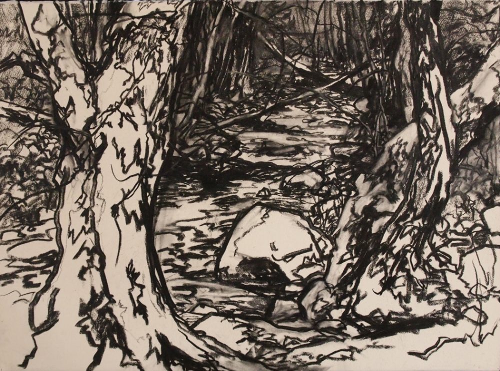 The sense of light and space in this large charcoal drawing are created almost exclusively by line weight and texture; it could almost be a woodcut. The gnarly patterns of bark and rock and water may evoke the fanciful forests of the English Illustrator Arthur Rackham, but this drawing was made on sight from nature. Trowbridge, who is a painter of landscapes with a subtle color sensitivity, has managed to create the feeling of color just in black and white.