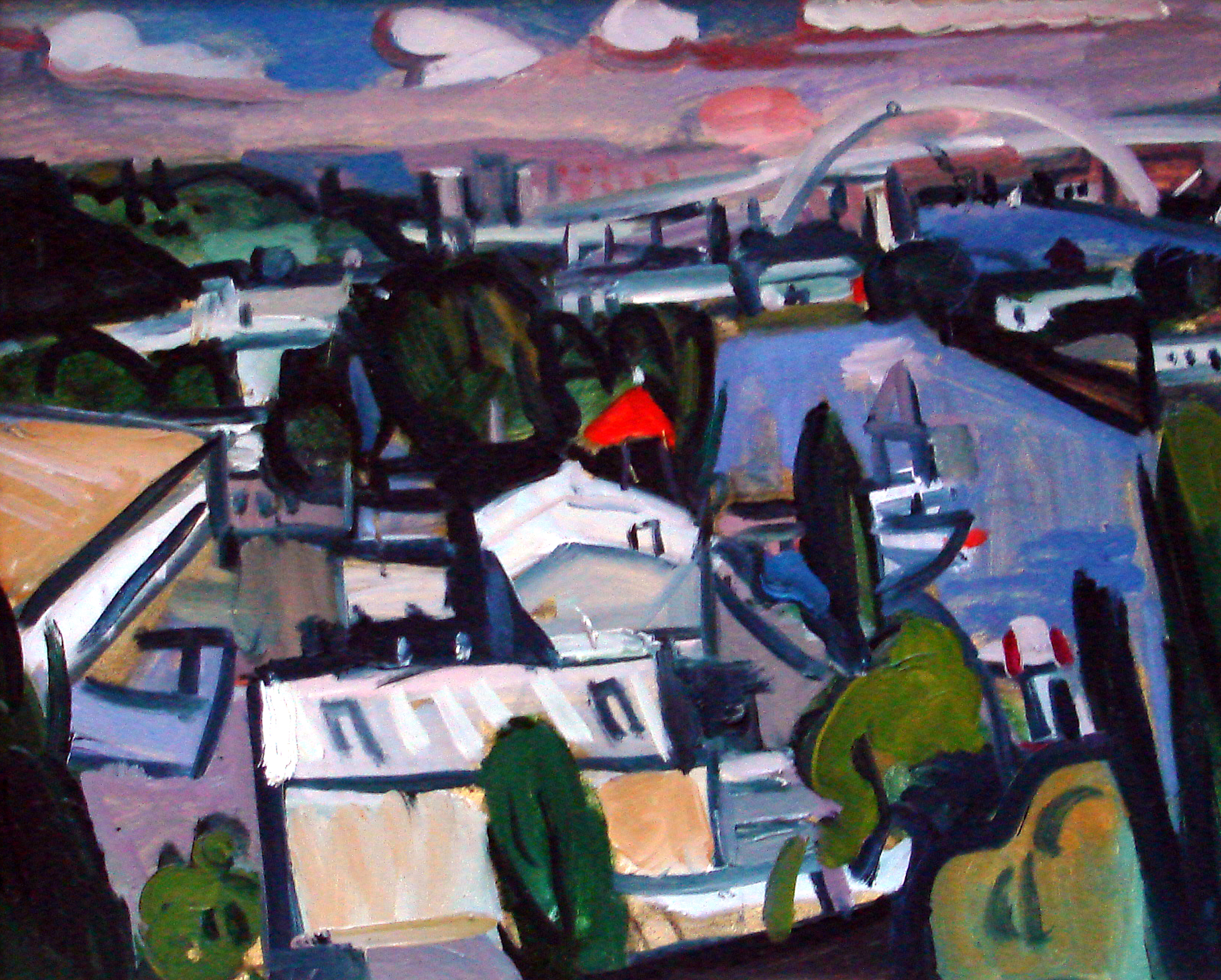 This was painted on site from the bluff at the University of Portland, where the artist regularly went to paint in the late 1990's and early Millennium. An exhibition of works from this period was held at the Buckley Gallery at the University of Portland in 2001 (see other works in the collection such as Happy New Year and Moonraker). The painting is constructed around primary colors with a dark blue saturation and punctuations of white. The ramshackle stacking of warehouse roofs and trees with the city skyline in the distance is the artist's favorite view of Portland's "back door." The clouds in the sky are reminiscent of elements on charm bracelets which were a fad at the time.