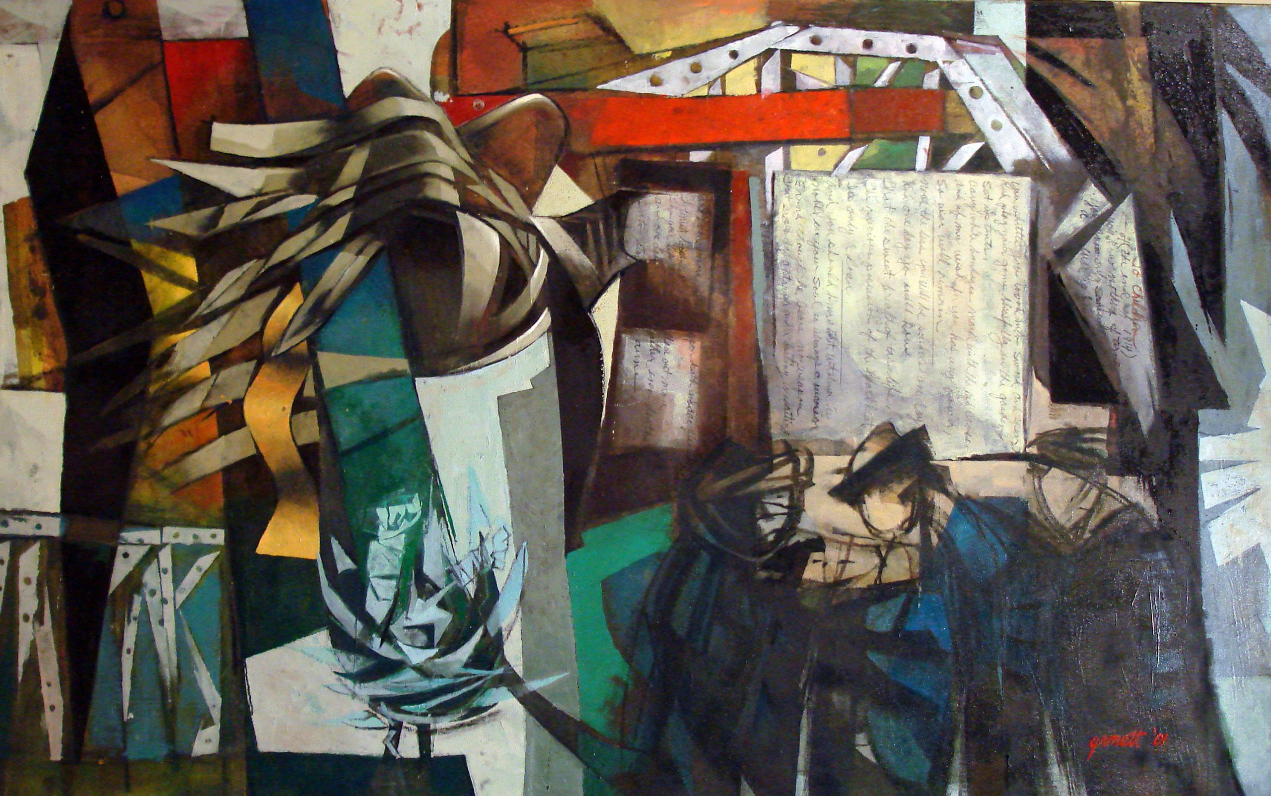 Garnett painted this in 2001 in the aftermath of 9/11. The twisted shards of metal may suggest the ruins of the Twin Towers and the figures crouched in the lower right could be the first responders. Hesse's poem could just as easily apply to that particular moment in history: