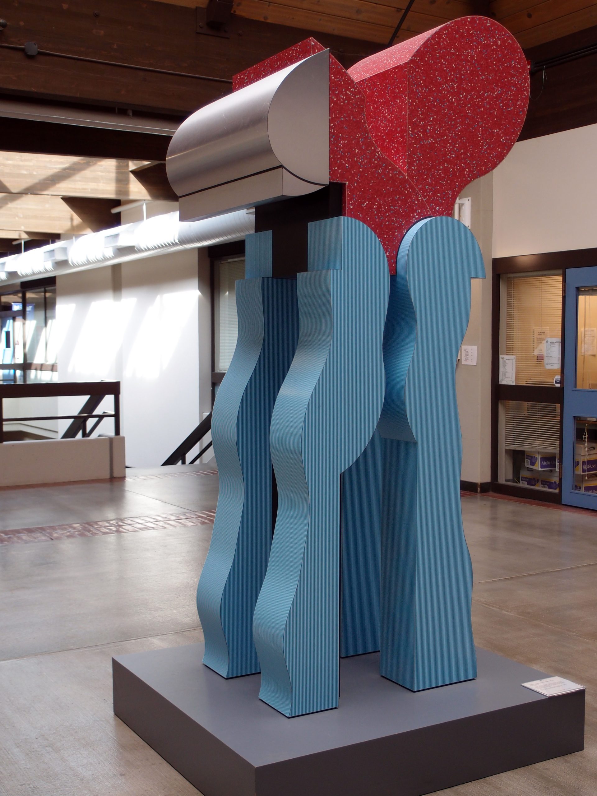 In the late 1980's, Mel Katz abandoned the traditional materials of sculpture and began, instead, to work with such non-art media as sheet vinyl. With its "faux" surfaces and brilliant colors, Katz asks us to take another look at the idea of large-scale sculpture and how it interacts with our environment. Although this piece is abstract, Katz also references the human form—note the pinstriped legs and printed torso.
