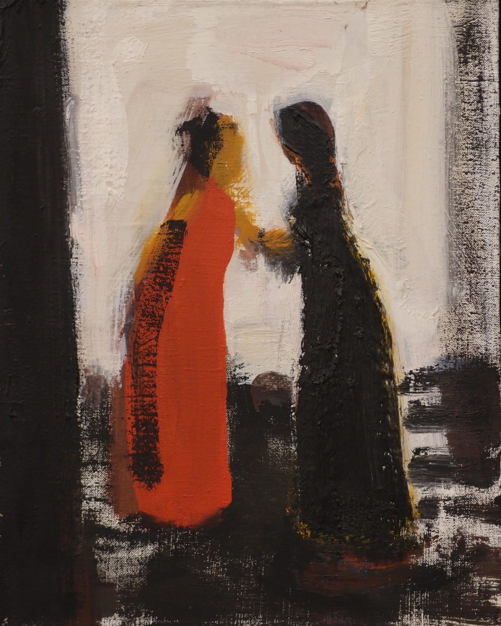 Two figures move together in silhouette, leaning towards one another against a bright window. The application of paint is thick and gestural, yet the more one looks at the figure on the right, the more realistic it becomes, with its subtle awareness of the balance of weight on hip, tilt of shoulders and angle of head. The figure on the left is more crudely painted, and the red dress would jump forward were it not for the audaciously long, dry, black stroke of the arm (?). John Keats wrote that negative capability was the quality of an intelligence able to hold two contradictory ideas simultaneously and still function; this painting shows an artist able to reconcile the love of the visible world and the plastic needs of the painting. Critic Ken Dixon, in appraising Mann's work, noted that "these are pictures that assert the radical proposition that it is possible for a work to be both stunning and authentic simultaneously."