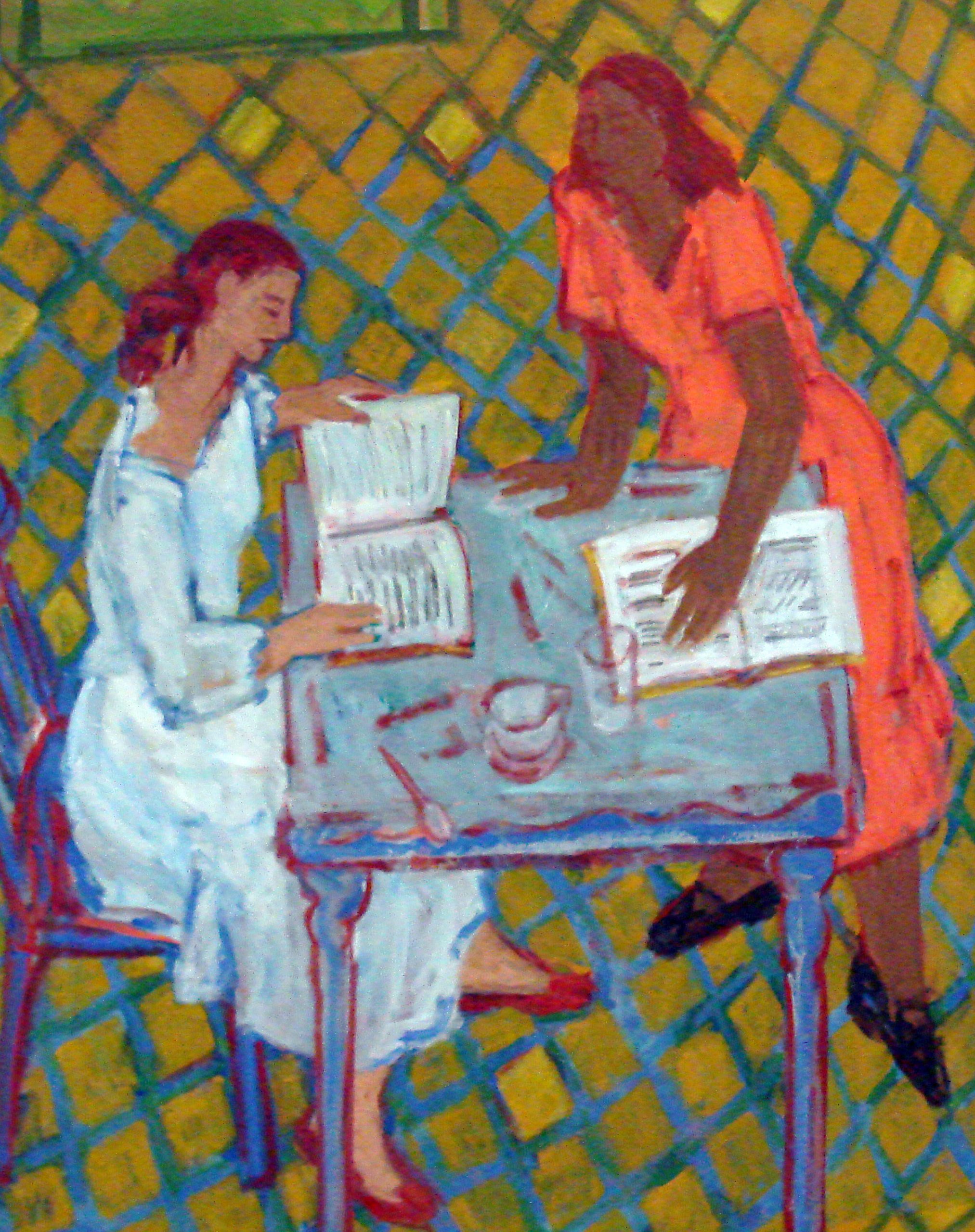 Grossman's monumental but intimate work shows two women gathered at a table studying what appears to be sheet music. Figures and furniture are brought right up to the surface: the table is seen in vertical projection (as if seen from above and from the side), not in linear perspective as it would in a photograph. To further flatten the space Grossman has added a diamond pattern rug parallel to the surface which functions both as floor and wall. But the effect is not to completely flatten but rather compress the space via parallel planes and overlapping. The paint handling is sensuous and the palette is built around the lush interaction of blue and orange, opposing colors in full strength and dilution. The artist has acknowledged the influence of Henri Matisse as well as Indian miniature painting on her work. She stresses the importance of visual pleasure in art. Grossman has said: "I am interested in flat and deep happening simultaneously through repetition and pattern."