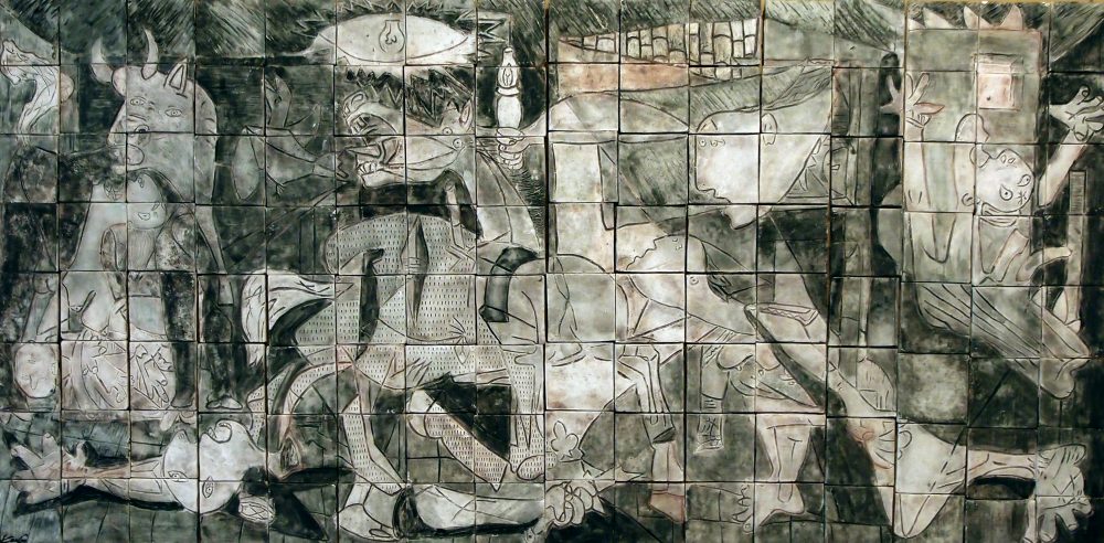 Art allows for conversations with the dead. For the 2012 student art show at Rock Creek, Nicholas Kengo Olson entered his "Guernica Again," a 52" x 105" work of ceramic tiles, and a pointed response to the American invasion of Iraq, drawing attention to its countless civilian casualties. The imagery for this work came from the greatest anti-war work of the 20th Century: Pablo Picasso's "Guernica" painted in response to the bombing of the Basque town of Guernica by Nazi planes at the request of the fascist Spanish government of General Francisco Franco. The bombing of this small town (with no strategic value and whose victims were mostly women and children) was a gesture to intimidate the anti-fascist movement in Spain. Picasso's dramatic 11.5 x 25.5' painting in stark black and white, was unveiled the Spanish Pavilion of the Paris Exposition in which both Nazi Germany and Stalinist Russia had large Pavilions. Picasso's painting drew international attention to the bombing and soon became the most effective anti-war painting of the 20th Century. Picasso's monumental work in black and white oil paint is graphic and dramatic, combining elements of reportage and myth. Kengo Olson also chose a limited palette for his work, but rather than oil paint he used 128 individually formed Raku- fired ceramic tiles with a fragile irregularity, incised with the trace elements of ash and limited rubbed pigmentation creating a charred, matte surface, suggestive of a ruin. Whereas the tone of the Picasso is a call to action, the tone of Kengo Olson's work is an elegy.
