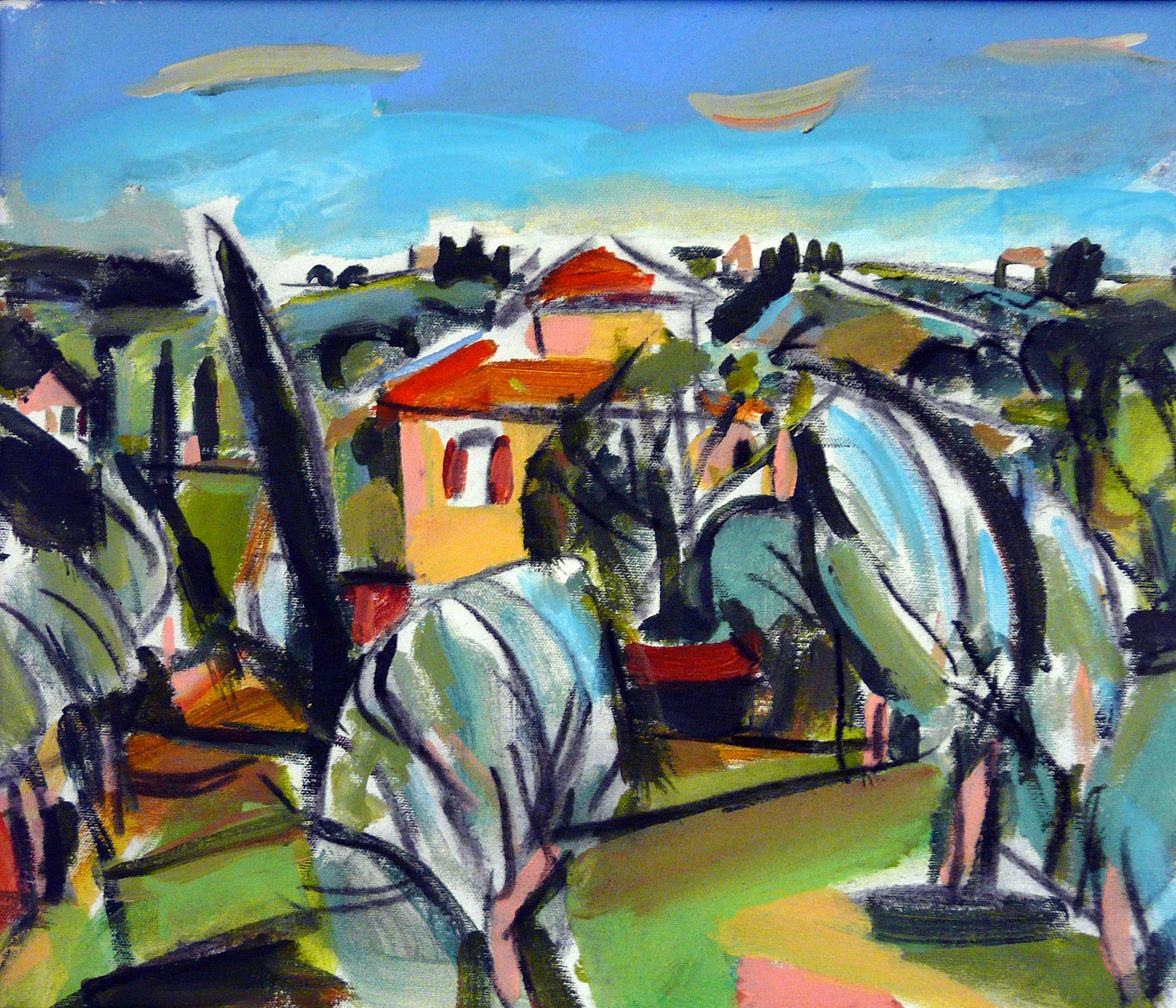 Andres travelled to Italy with 20 PCC students in 2005 for a two week immersion in landscape painting and art history team taught with Andres' colleague, art historian Susanne Tringali (who also has art in the Rock Creek collection). In the two hour window between the end of his teaching day and the beginning of dinner, Andres set up his easel and painted the old farm buildings nestled in the ridges of the Tuscan hills. The group was staying at Castelfiorentino outside Florence at an "agriturismo" (agricultural tourism) bed and breakfast which afforded splendid views and proximity to major art museums and cathedrals. This painting was made from the upper olive orchard looking towards the main farmhouse where the host family lived.