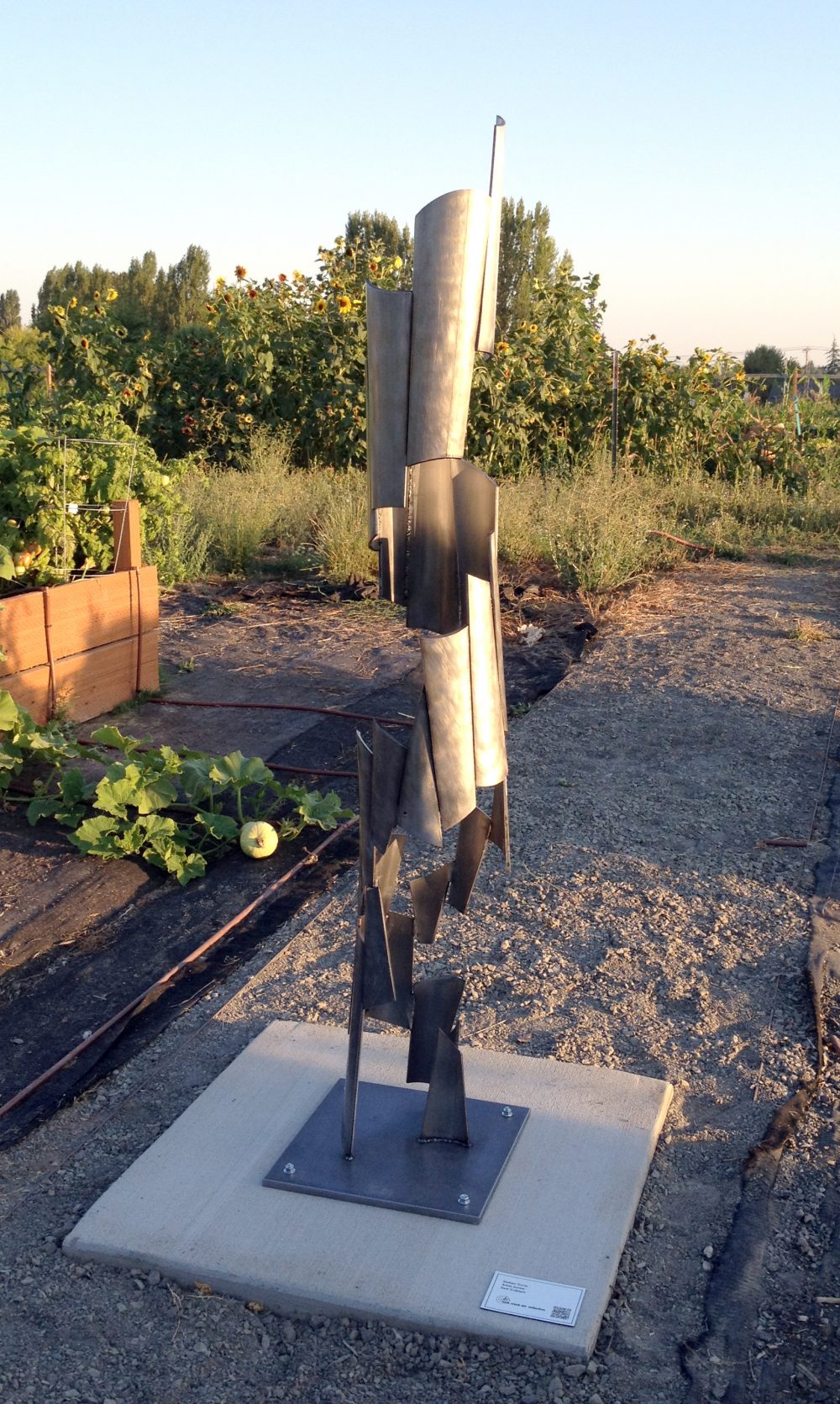 This sculpture represents an artistic journey. This is my first sculpture, hopefully the first of many more. This piece is made of steel and has been polished to brilliant sheen. The surface is prepared to catch and reflect light, to enhance the learning garden. I hope that when you gaze upon this sculpture, it encourages viewers to think of their own journey.