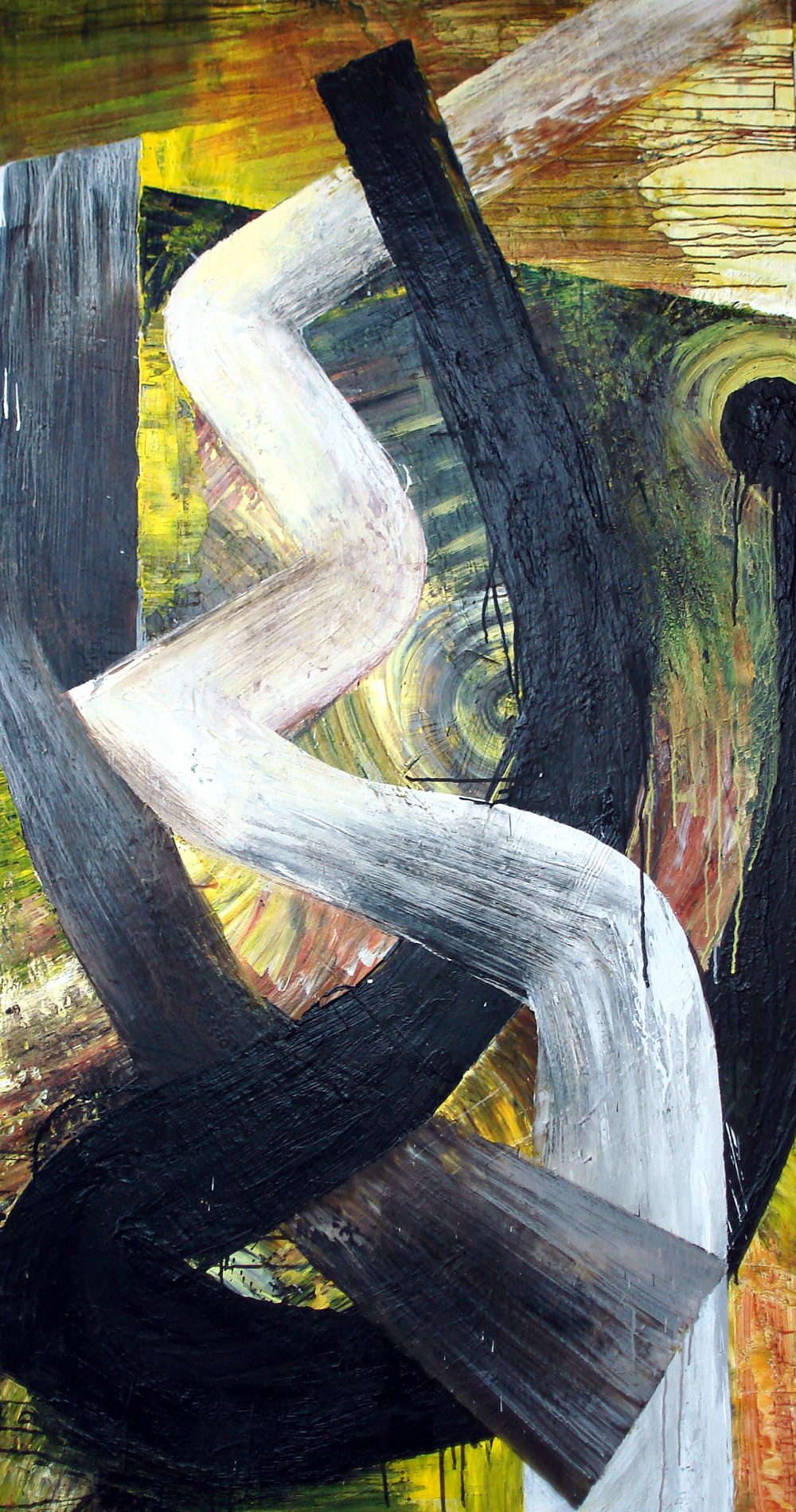 Krummholz (German: krumm, "crooked, bent, twisted" and Holz, "wood") is a type of stunted, deformed vegetation shaped by continual exposure to fierce, freezing winds such as one would encounter at the timberline of Mount Hood. The painting takes the forms of these twisted, blasted trunks and abstracts them into a graphic zig-zag of pictorial tensions of yellow and black. "I love black and yellow," says Parker, "so deliciously ugly, the strongest possible contrast between color and value (like) bumblebees and highway warning signs."