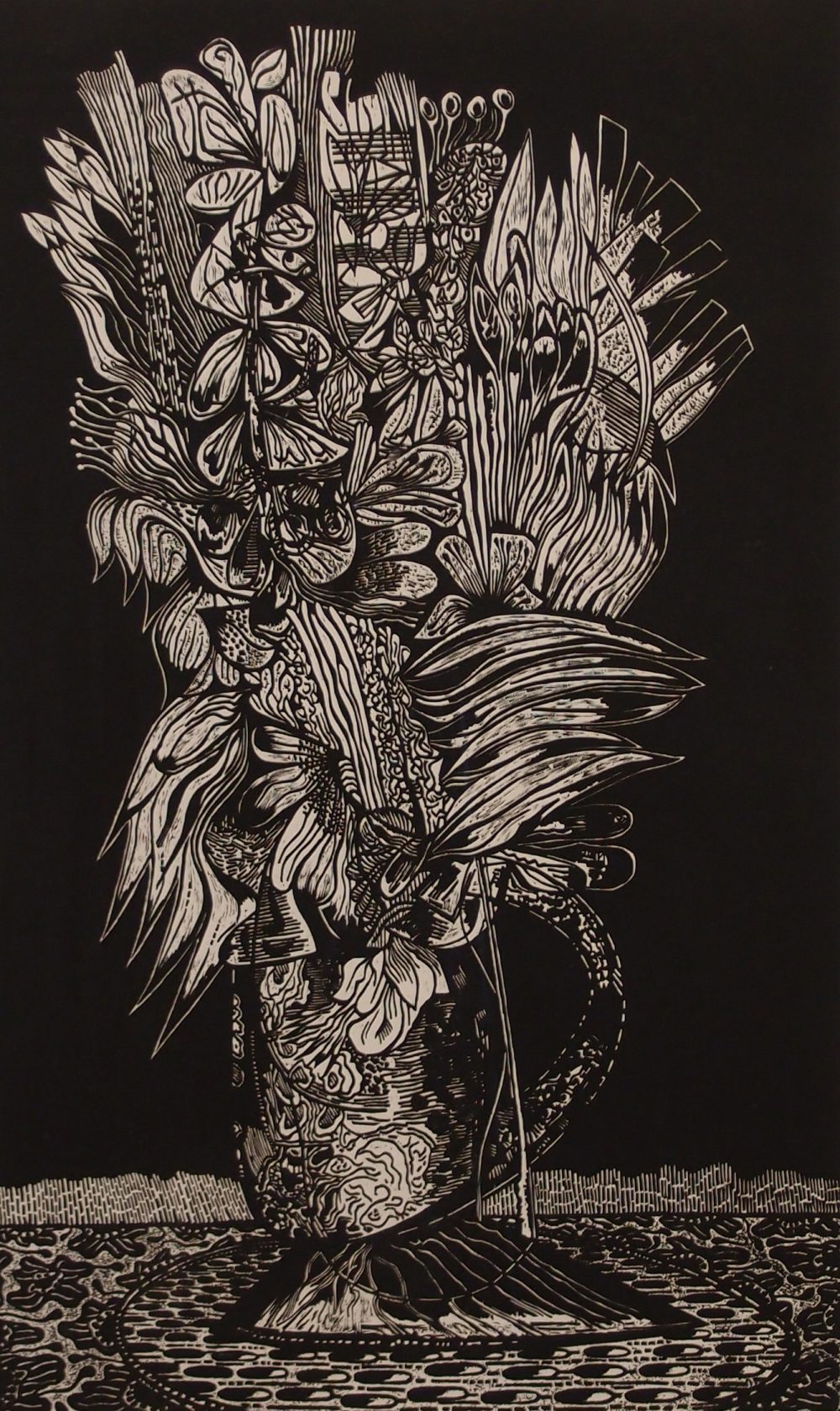Manuel Izquierdo's exuberant and graphically inventive prints celebrate the spectacle of life—circuses, rodeos, beautiful women, and lush flowers—as well as a deeper world of myths, folklore and legends. While he was proficient with a number of printmaking techniques, Izquierdo was drawn to the immediacy of the woodblock. This masterfully carved print in which each texture and shape has a vividly different pattern is like a whole orchestra of marks that together create the feeling of a burst of music. Izquierdo's woodcuts have a strong relationship to those of Jack McLarty, George Johanson and Eunice Parsons, all of whom are in the Rock creek Collection, and all of whom taught at the Portland Art Museum's School (now the Pacific Northwest College of Art).