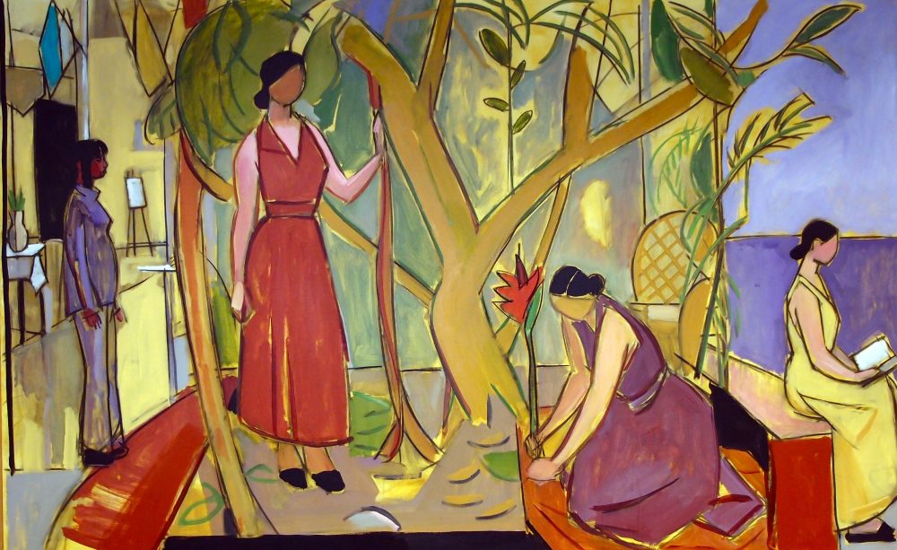 This work was made as a public demonstration of figure painting at the ArtBeat festival at Rock Creek in 2014 under the Banyan tree in B3. The main model was Megan Baron, who appears in three faceless poses in foreground – standing, planting and reading surrounded by vegetation and the sea. A second model, Jameesha Walker, who was late to arrive to the session, only appears in the left side, standing awkwardly in an institutional space. The placement of the three white and faceless figures in the foreground and the black model with a face in the distance was an intuitive choice at the time, but could underline the way a person of color may be marginalized in group settings and to whom the privileged may seem interchangeably faceless. To navigate such a situation a pole star or North star may be needed.