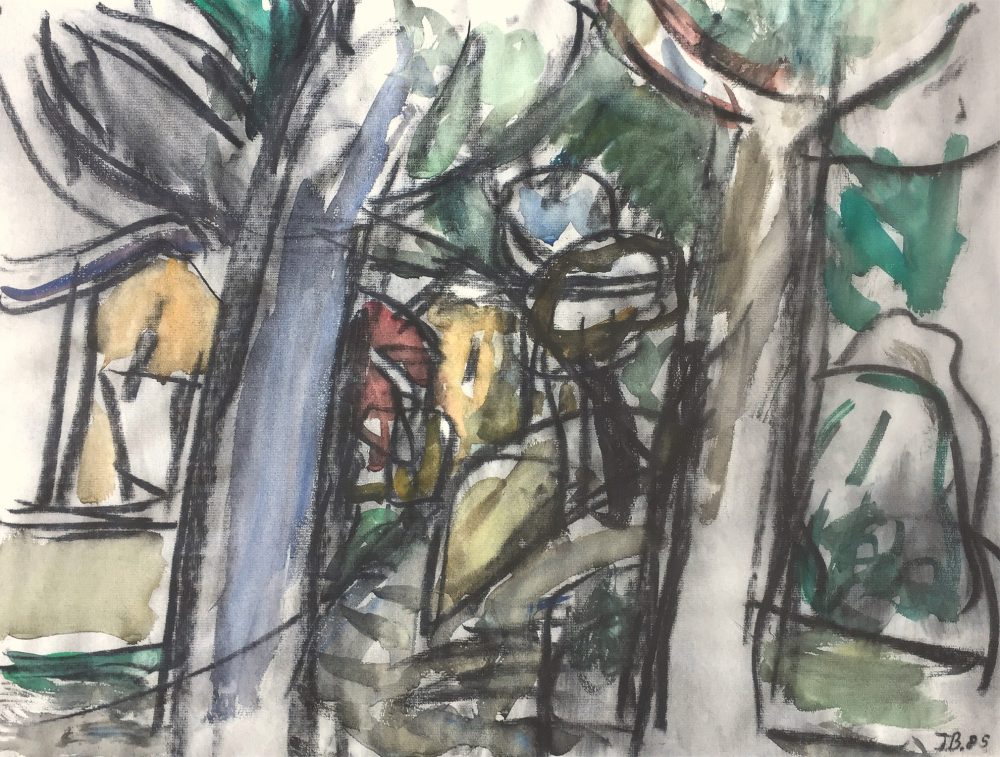 Thomas Barron's "Parkman Street, Brookline, MA" is a lively charcoal drawing with thin watercolor additions characteristic of the plein-air work this artist produced from the early 1970's to the mid 1980's when he was part of the Boston-based Direct Vision Group of painters founded by Jason Berger (1924-2010). Heavily influenced by a Modern compression of pictorial space, this work has a strong lyrical rhythm reminiscent of Chaim Soutine. The street leaps up like a roller coaster, but is held down by the two thick tree trunks which frame it, creating an animated dance of motion and stability. The abstract qualities of shape, color and movement are, in the artist's words, the "real subject" of the painting. After the mid 1980's Barron's work became increasingly abstract and even more strongly gestural. He writes, "I am interested in setting down what excites me in the many visual dramas I see being played out within nature. These 'dramatic' dialogs have their own worlds of line, space, color, and form and are the real subjects of the work."