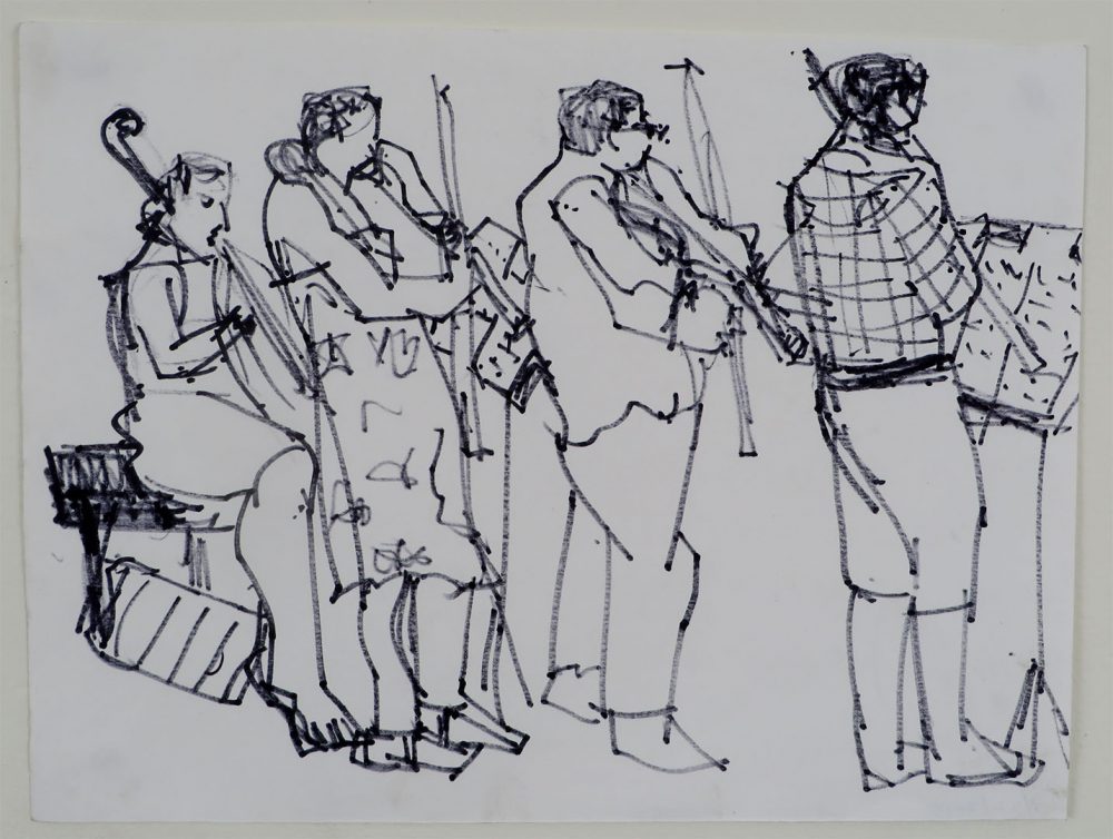 Artists have long chosen musicians as subjects, out of a sense of solidarity as much as the fact they remain relatively still enough to draw. Often such drawings create a sense of repeated rhythms that seem to evoke musical intervals, as is the case here, where the relationships of all those parallel diagonals of bows, legs and instruments are punctuated by the verticals like the rhythmic progressions in music. Beckerman was a student for many years at Rock Creek, where she studied painting, drawing, printmaking and sculpture.
