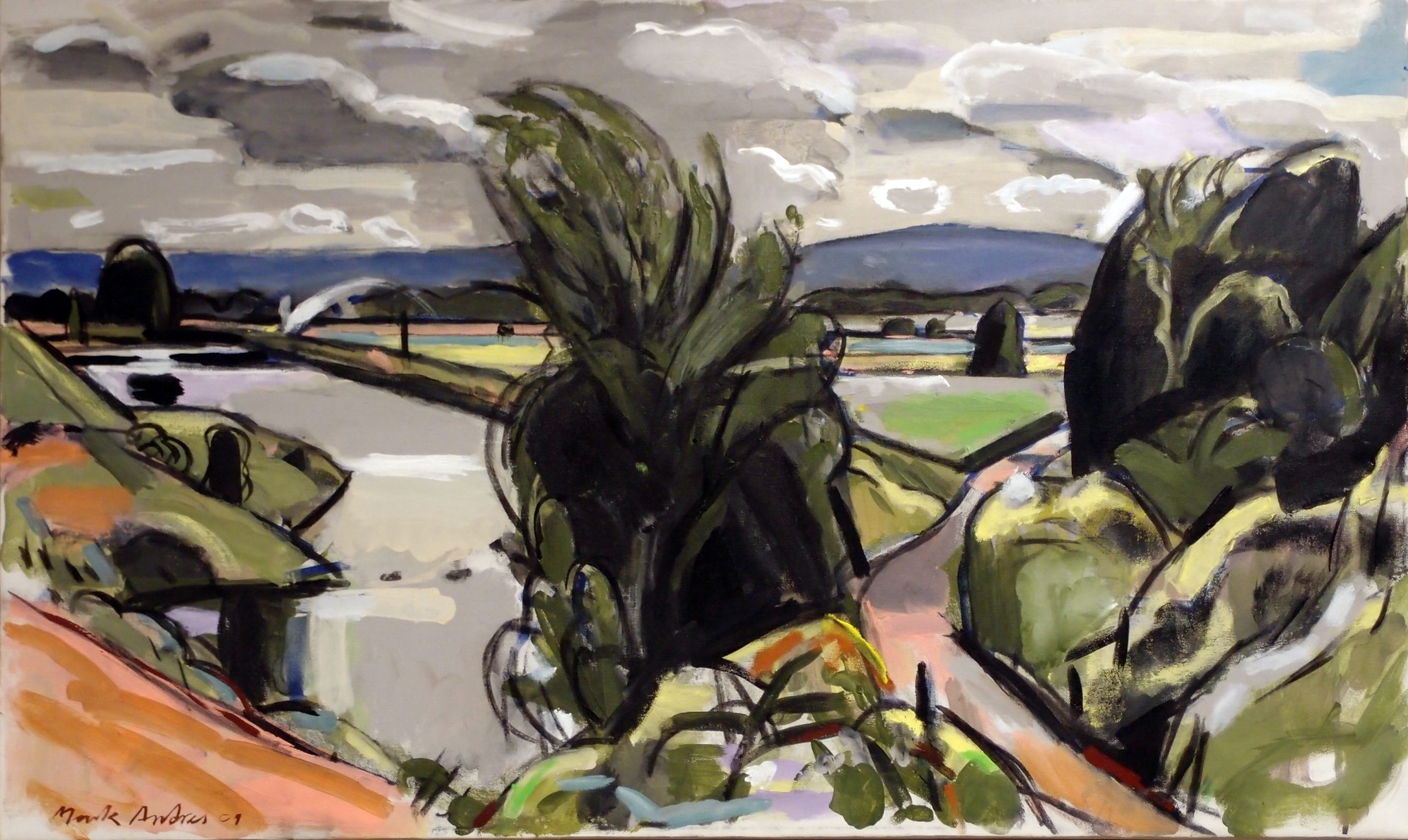The landscape of Sauvie Island has attracted painters from Portland for years – perhaps because it has a very different character from the rest of the region. The island landscape is as flat as Holland, yet the dikes allow for elevated views. This view from Reeder Road has been painted by such diverse artists as Phyllis Trowbridge, Tom Prochaska and Stephen Hayes. This version of the view by Mark Andres emphasizes the diverging paths of road and water bathed in a crisp, silvery light. This work was exhibited at an invitational show at Gallery 114 in 2009 called "Distillation" curated by David Schell.