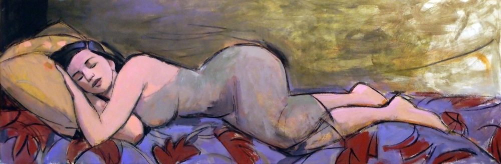 A woman wearing a grey dress sleeps on a patterned coverlet. She is nearly life size. This was painted in the artist's studio. The model was Megan Baron. With a gentle movement from right to left, the painting is designed to evoke the feeling of floating into sleep.