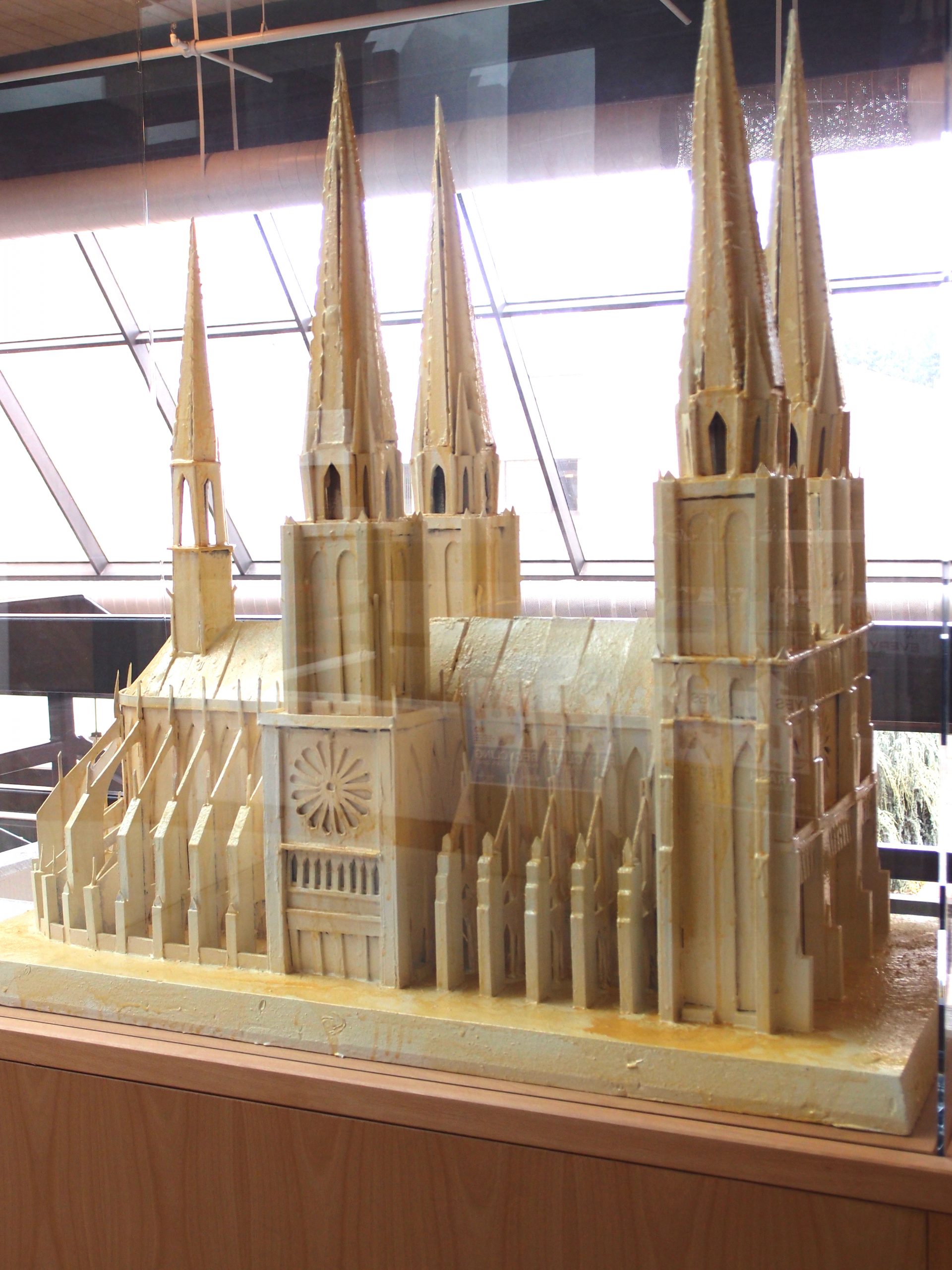 Eugéne Viollet-le-Duc (1814-1879) was a French architect now considered to be one of its greatest theoreticians who had an important impact on modern architecture. He was commissioned to help restore Notre Dame after the ravages of the French Revolution. Buswell's model, based on the architect's drawings for proposed changes to Notre Dame including four additional spires (!) remained an imaginary ideal cathedral after the funding for the proposed additions ran out. Buswell's sculpture is a conceptual monument to religious faith ironically named after the religion's greatest skeptic, Doubting Thomas, who would not believe in the resurrection until he had empirical proof by sticking his finger in Christ's wound. Fittingly, one of the gargoyles added to the single spire of Notre Dame in the restoration was the figure of doubting Thomas carved in the likeness of Viollet-le-Duc.