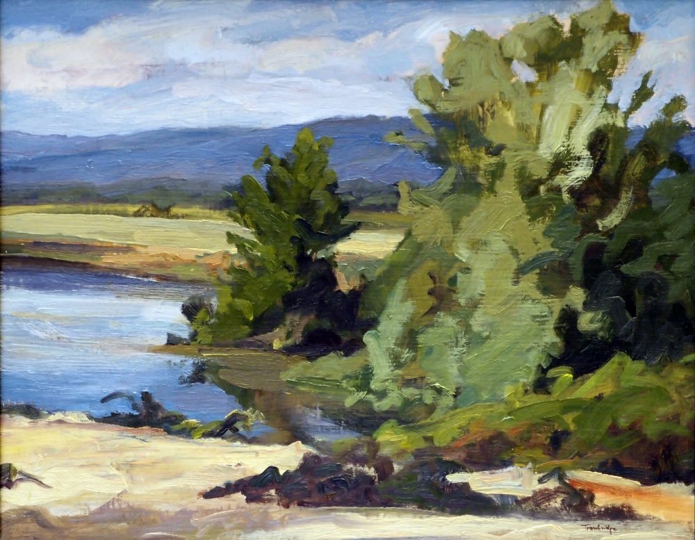 Phyllis Trowbridge works en plein air—painting out of doors, on site—and her compositions, in watercolor, charcoal, and oil, capture the beauty and nuances of light, atmosphere, texture, and space. But her works are more than simply transcriptions of landscapes. They are, instead, about looking deeply and responding, both intellectually and emotionally to what she sees. Trowbridge has lived in Oregon since the mid-1990s. She is a graduate of Hamilton College and received her MFA from American University in Washington, D.C.