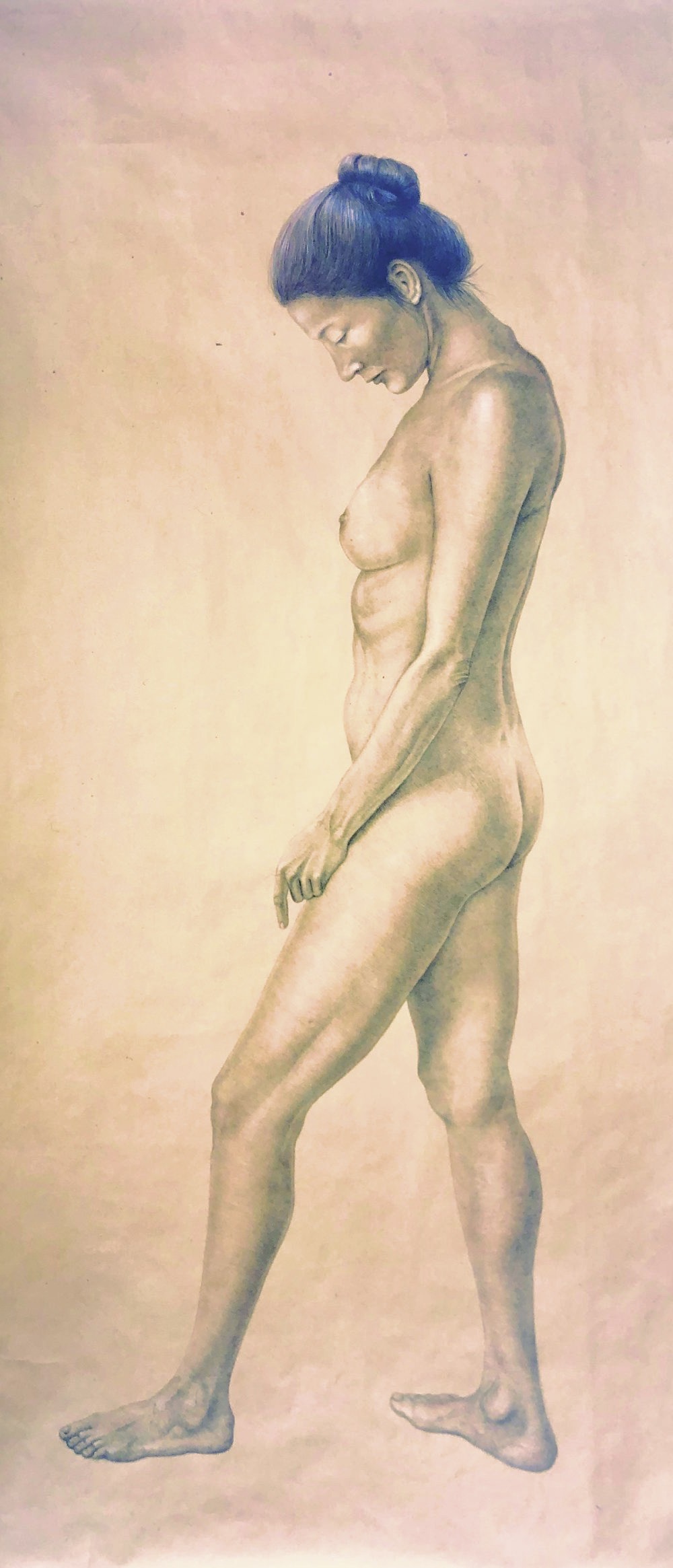 This life-size drawing in colored pencil on brown paper demonstrates an intense scrutiny of the human form through a delicate, warm glow of closely related, precisely limned, pencil marks. The drawing was exhibited in a figurative group show at the Laguna Art Museum in 1997. Green's more recent work has focused on the form of a single tree, intensely rendered, on a blank ground, or a solitary wandering figure in a desolate landscape with mysterious narrative implications.