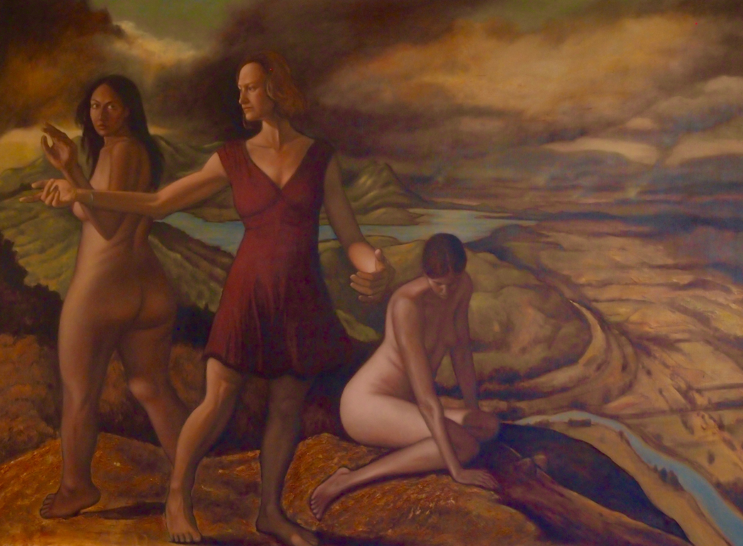 This large painting combines the artist's love of Baroque figurative painting with the New Zealand landscape. He refers to the series of large figurative paintings he began in 2005 as "lost mythologies." In his statement to his solo exhibit at Art at the Cave (Vancouver, WA) Southern wrote: "The mythology and storytelling of indigenous cultures, western civilization, and my own amalgams of memory, invention and reflection are thrown into the narrative mix... These new allegorical images are ... offering a way forward and through our current condition. The characters depicted in this body of work are stage actors in a new mythology. The primacy of the feminine form and feminine power has always been a key element in this work." This work was exhibited in the Helzer Gallery in 2015 and purchased by the Rock Creek Woman's Resource Center in the same year.