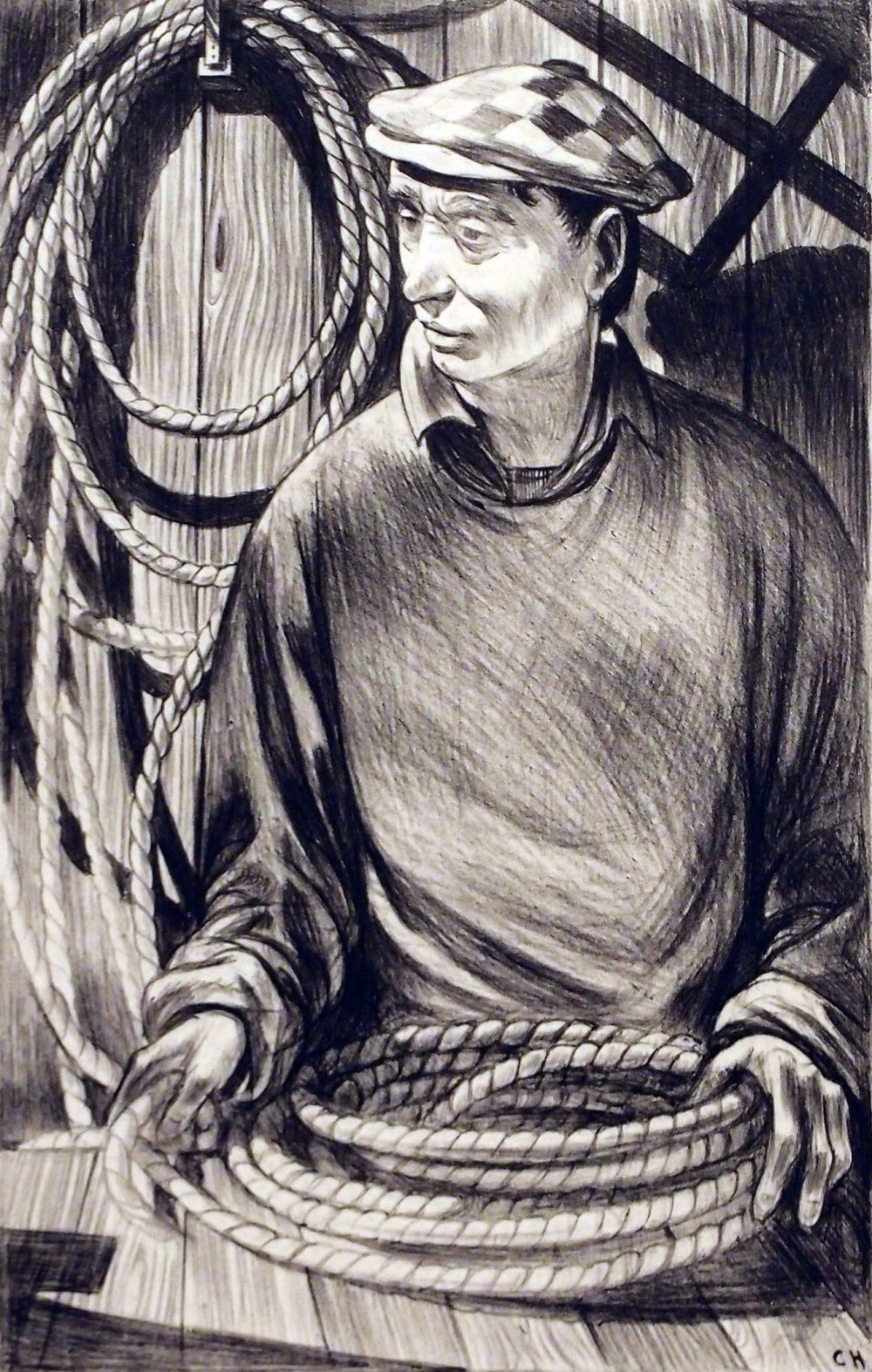 "Rope" suggests the illustrative regionalism in American art of the Great Depression. A dual interest in realistic texture and abstract shape underlies this work: the sensuous attention to the highly rendered textures of weathered wood, cloth, flesh and hemp are scaffolded by repeated diamonds and coiled or slack curves. The underlying structure reflects the artist's belief that the languages of realism and of abstraction are utterly compatible. The subject also reflects with Hall's thematic celebration of Oregon industries (fishing).