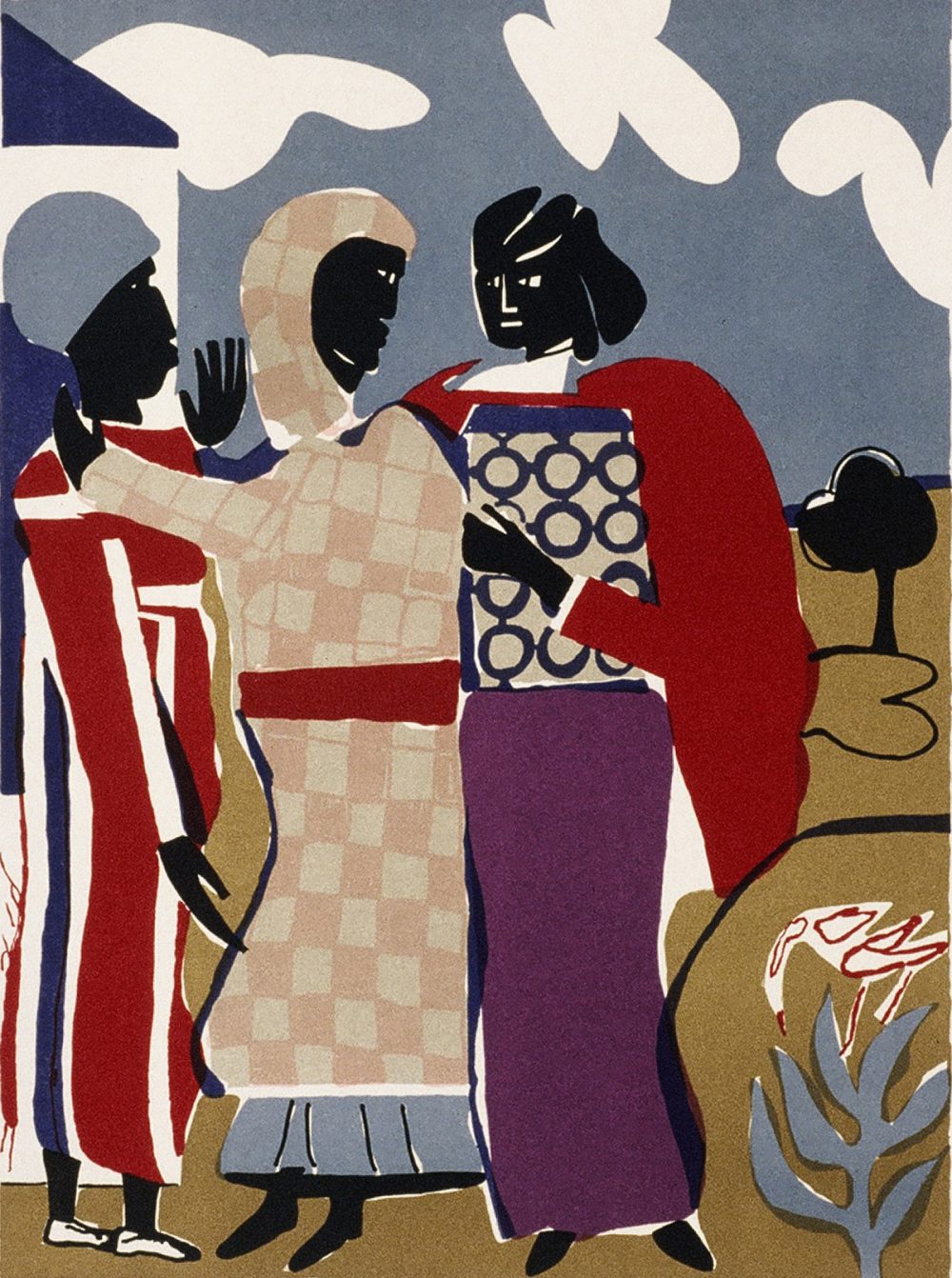 Three women stand together in bright, colorfully patterned clothing under a sunny, blue sky. Their hands reach out for each other in the act of greeting upon arriving at church for Easter Sunday service. A bird rests on a shrub along the lower right of the composition. Romare Bearden, who often drew on compositions by past artists as a way to envision scenes from his early childhood in North Carolina, may have based this on a Renaissance painting by Pontormo (The Visitation). However, the style of this lithograph is heavily influenced by the artist’s own collages with their strong sense of shape interlock, as well as by the flattened space and patterns in Byzantine and Indian art. The heads of the women evoke African masks, photos of which Bearden often used as elements in his collages for the faces of his figures. Sometimes the most original art comes from the wildest combination of influences.
