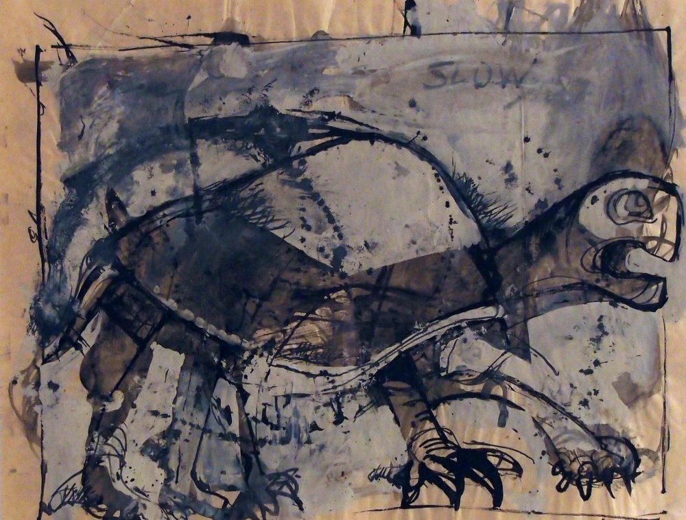 Drawing was at the core of all of William Garnett's work. This lively ink drawing of a tortoise made on crumpled brown wrapping paper with ink applied very quickly and gesturally with a bamboo pen over grey washes of gouache (opaque watercolor) has the snap of speed but ironically depicts a very slow moving creature. The expression on the face of the tortoise is comically ferocious, almost outraged at its inability to move faster, and may be considered a self-portrait, as it does resemble the animated intensity Garnett would adopt sometimes when he was drawing at full speed. Abstraction was also at the core of his work and the thick undulating snake-like form that moves through the tortoise's body as an extension of his neck is a wonderful invention to create the sense of slow movement. Garnett's drawing was heavily influenced by the work of California artists Howard Warshaw (who experimented with X-Ray effects in his drawings), and Rico Lebrun (whose line quality this drawing resembles).