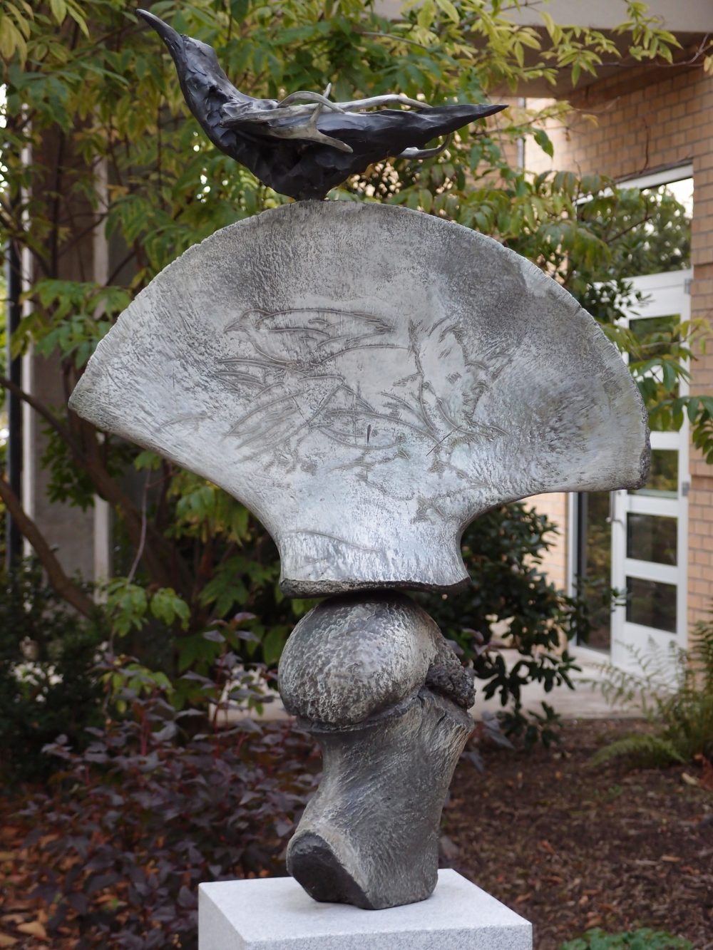 Frank Boyden is perhaps best known for his extraordinary ceramic pieces, on whose surfaces he scratches and etches the flora and fauna of his native Oregon. But he is also a renowned printmaker and a sculptor who has been casting his works in bronze since 1989. As Boyden notes, his sculpture, which he considers public art, is always conceived specifically for the site it will occupy: in this case, Boyden was responding to the science classes that take place in Building 7. Boyden received degrees from Colorado College and Yale University. In 1970, he founded Sitka Center for Art and Ecology.