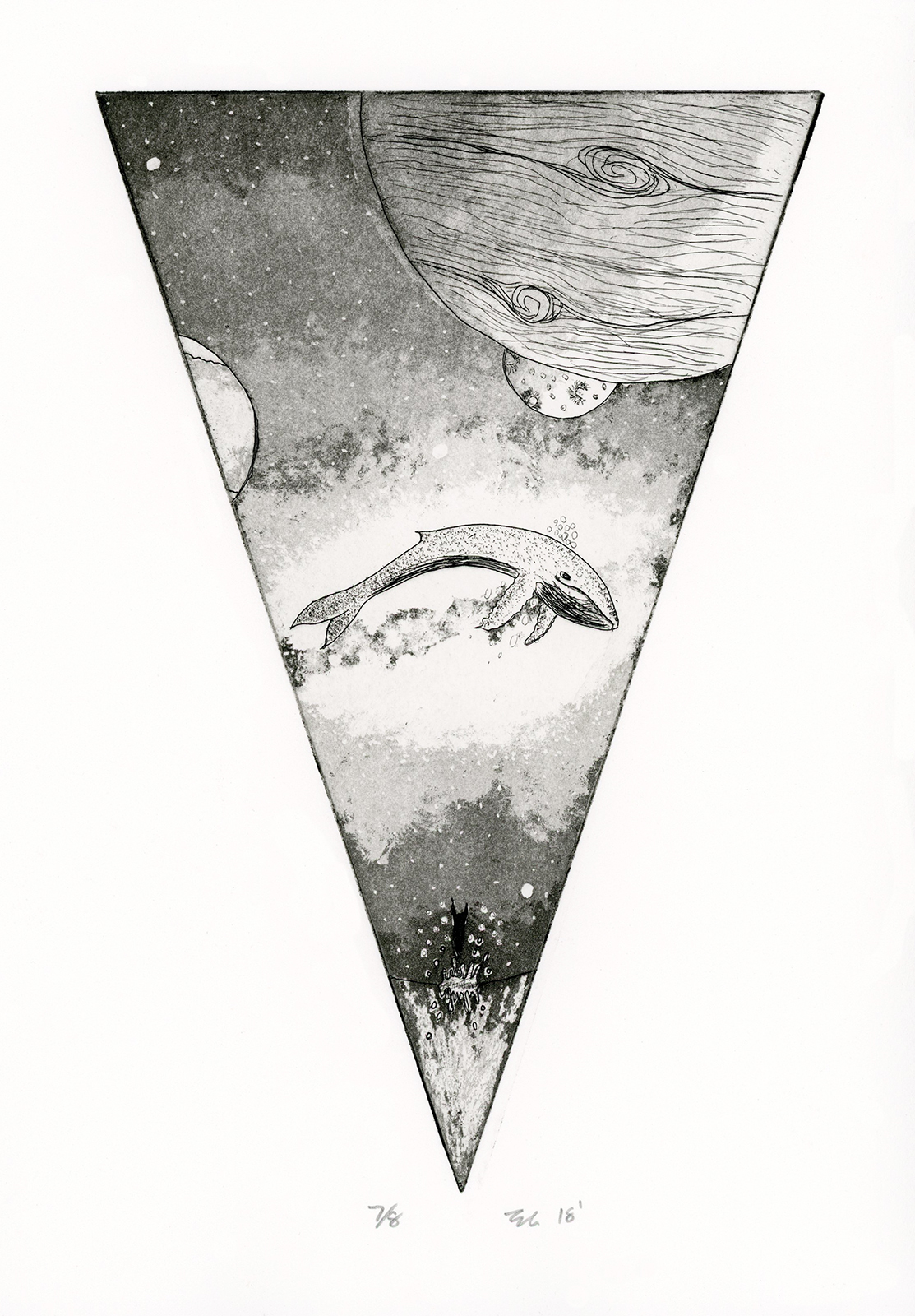 This print was created by a student in ART 270 Printmaking during the Spring 2018 term. Each section of ART 270 focuses on an individual process—etching, traditional Japanese woodblock or oil-based woodblock printmaking. This work was one of several selected to share with the PCC community because of its strong personal vision and unique approach to the particularities and possibilities of the media.