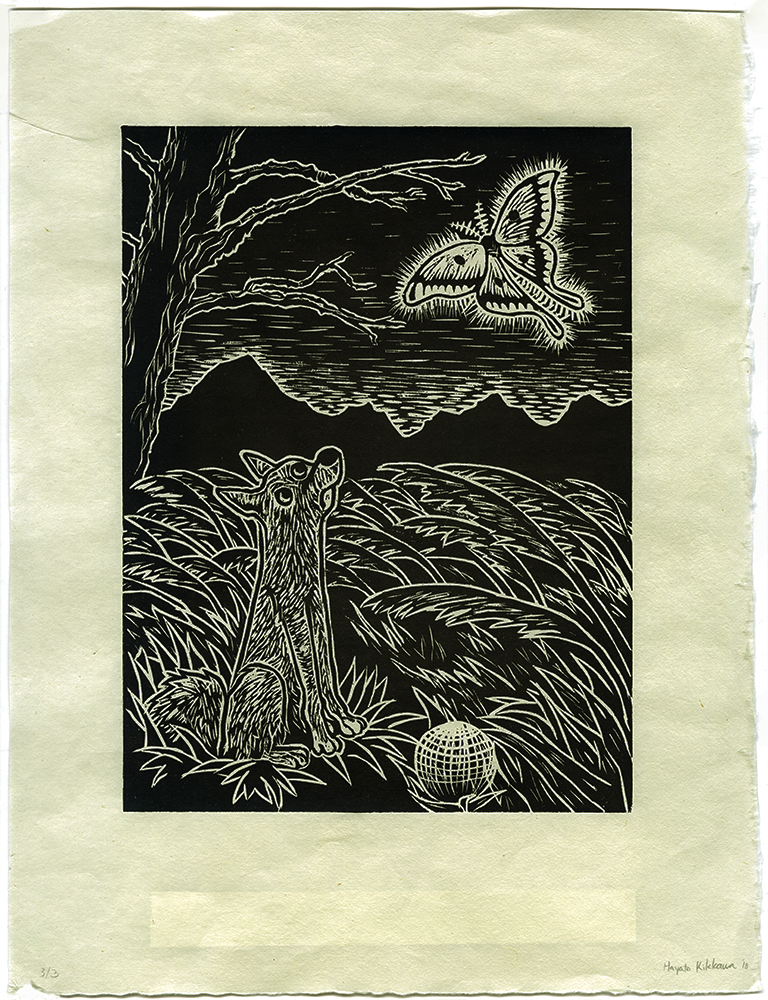This print was created by a student in ART 270 Printmaking during the Winter 2018 term. Each section of ART 270 focuses on an individual process—etching, traditional Japanese woodblock or oil-based woodblock printmaking. This work was one of several selected to share with the PCC community because of its strong personal vision and unique approach to the particularities and possibilities of the media.