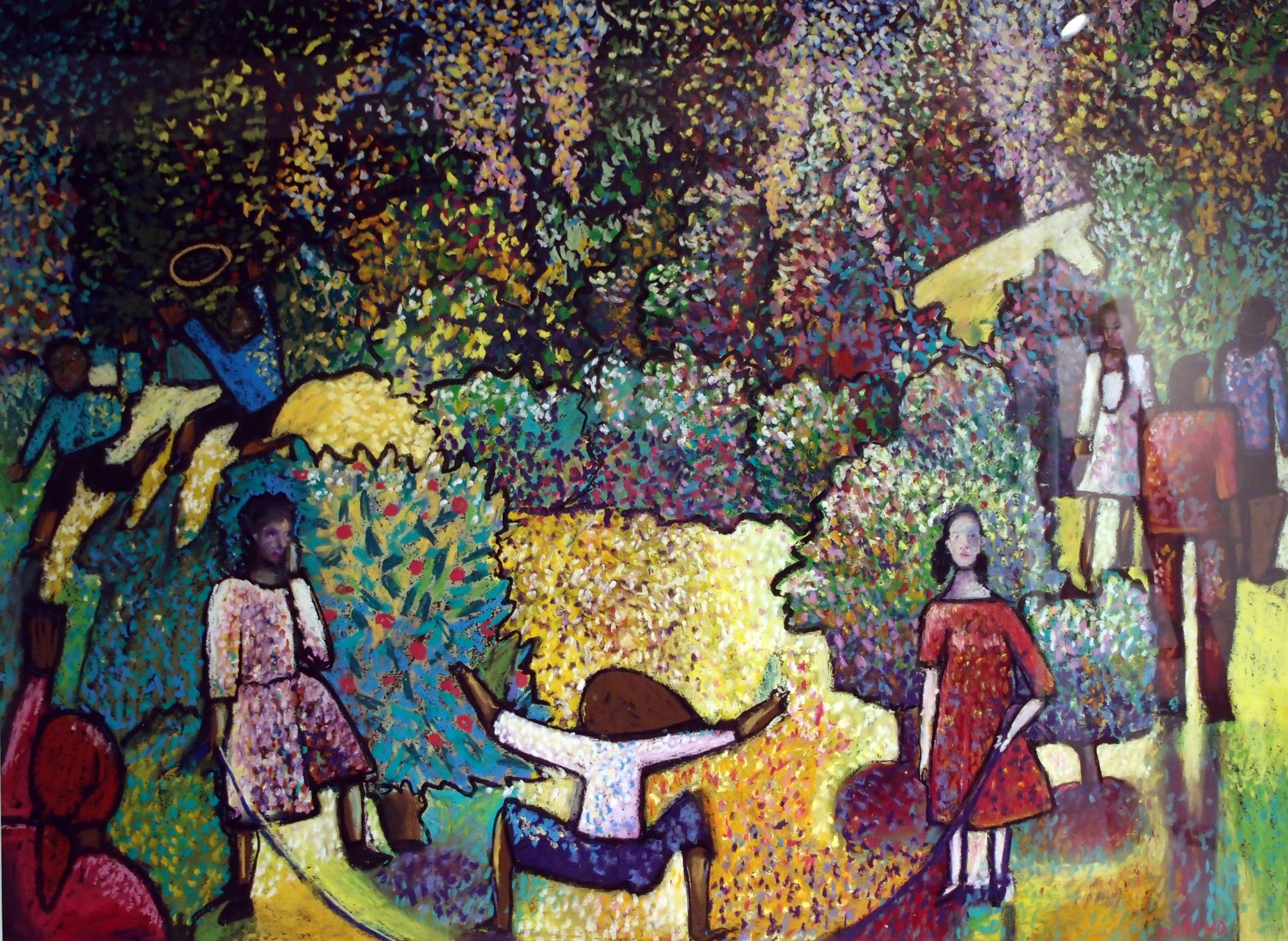 The artist made this when she lived across the street from Laurelhurst Park off 38th and Stark Street in Portland. She describes the image as a celebration of the beauty of the park but also a reminiscence of her childhood in Sublimity, Oregon and jumping rope at the grade school playground. The medium is oil pastel on a large sheet of black paper, donated by an architect friend. The style may evoke Gustav Klimt as an influence, as well as the artist’s interest in particle theory.