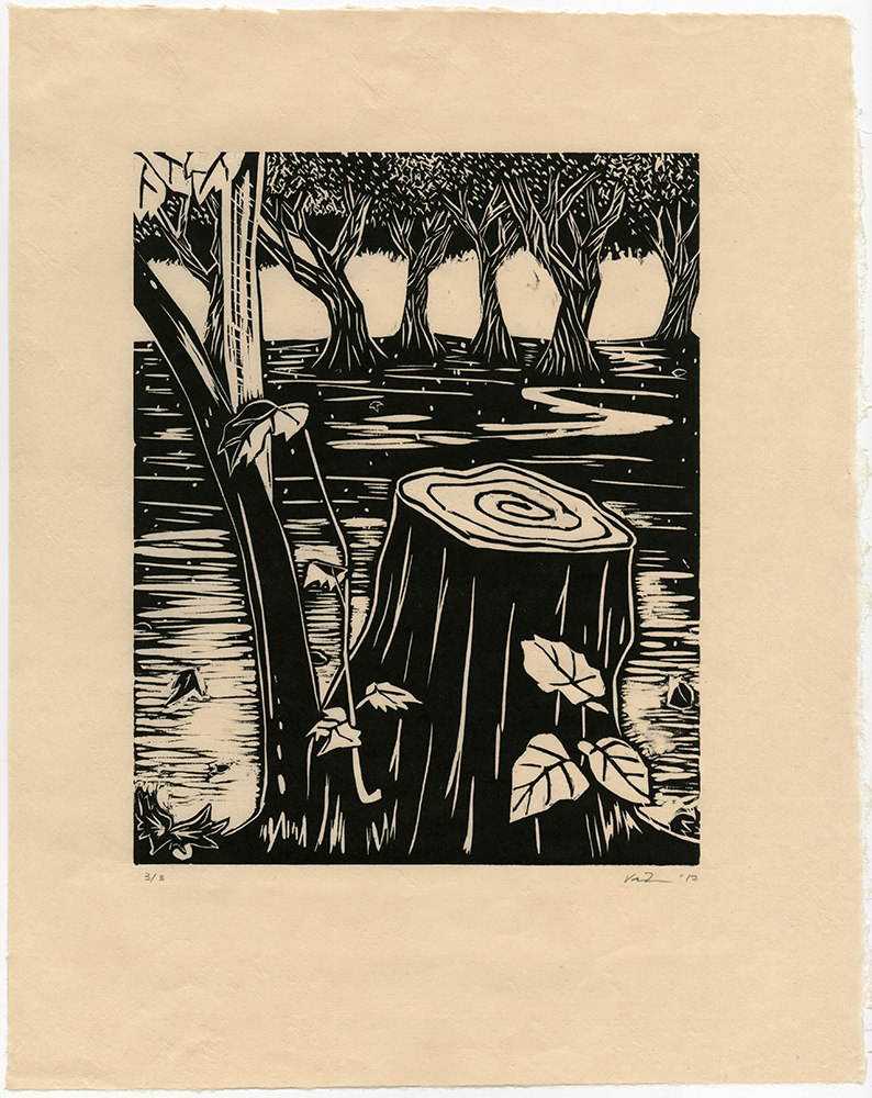 This print was created by a student in ART 270 Printmaking during the Fall 2017 term. Each section of ART 270 focuses on an individual process—etching, traditional Japanese woodblock or oil-based woodblock printmaking. This work was one of several selected to share with the PCC community because of its strong personal vision and unique approach to the particularities and possibilities of the media.