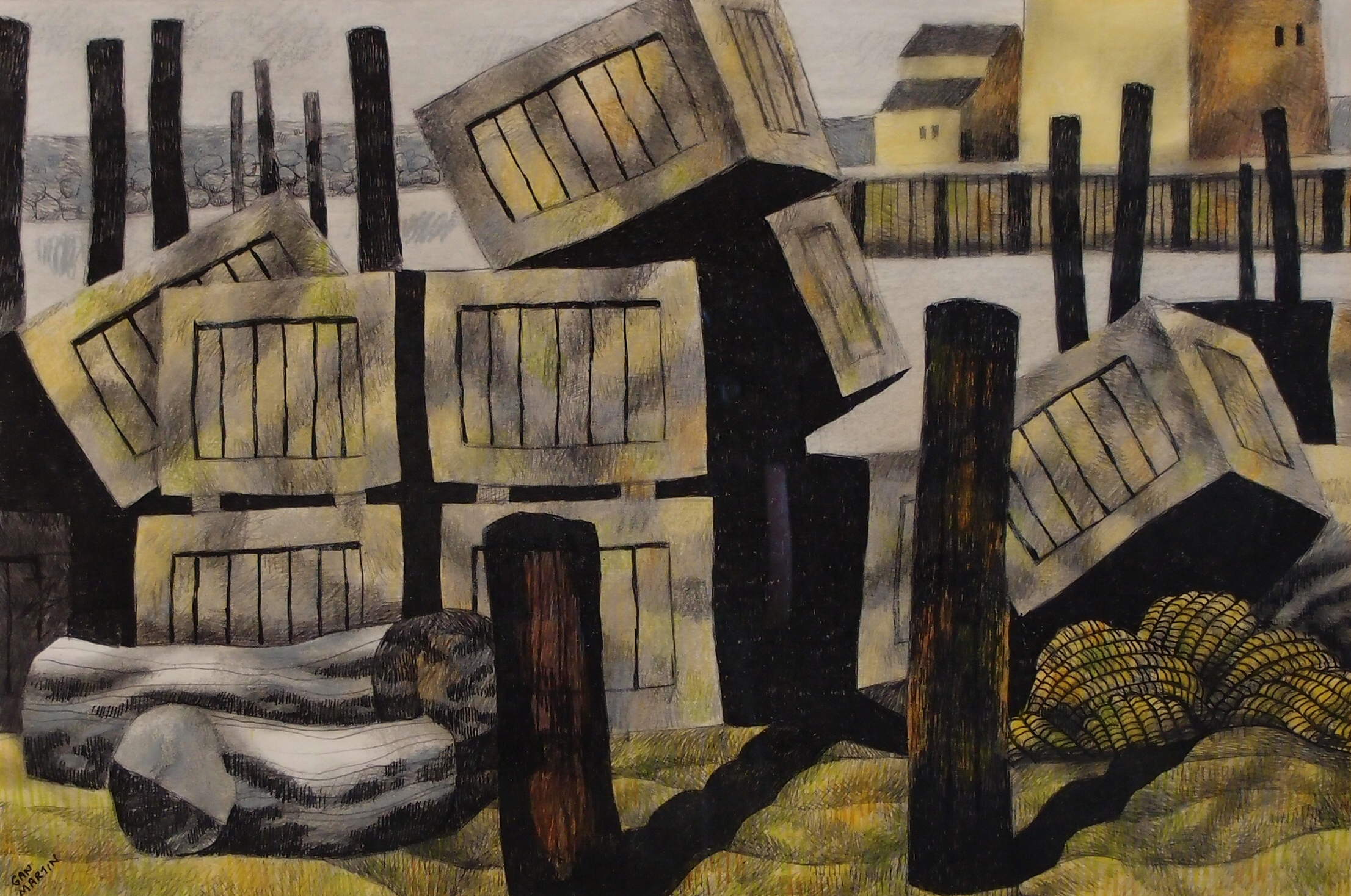 Gan Martin was heir to a tradition of Oregon painting that goes back to the early 20th century. While he certainly was in touch with later trends in art, including modernism's tendency to explore abstraction, Martin was at heart a figurative artist. His drawings and paintings exemplify the traditions of regionalism: he depicted the natural world and the incidents and objects of daily life. Martin lived in Coos Bay for more than 40 years, so the coastline of Oregon and its forests and farmland were his territory. He excelled at finding unexpected beauty in familiar, often modest objects—rusted bolts, shotgun shell casings, a pile of logs—but he also made landscape paintings that analyze the architectonic forms of the region's geology and capture the space and light of the Pacific coastline.