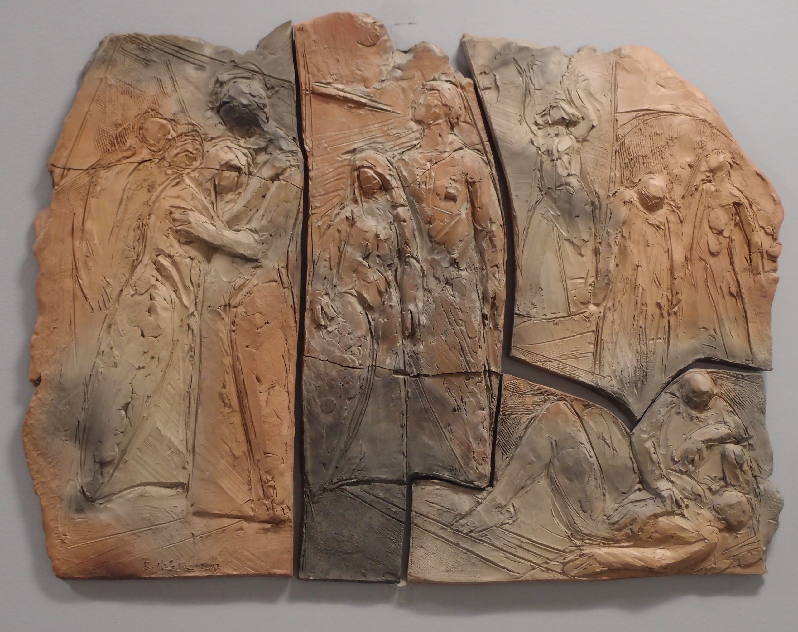 This bas-relief by Richard Helzer (1940-2006), of four jagged, interlocking clay slabs on which appear several incised or sculpted figures in gestures of grief, resignation, defiance, or exhaustion was made in 2003 as a response to the events of September 11, 2001. The slabs have a rugged, organic quality suggestive of tectonic plates; the clay has cracked in the firing and been repaired, giving the work a ruined, battered look. The unglazed stoneware has been bisque fired and then put in a Raku kiln using the Saggar-fire technique, where the porous clay surface absorbs trace discolorations from adjacent materials such as newspaper ink, metal, or moss, creating an unpredictable, ashy gray or black stain against the natural warm tones of the clay. The figures are generalized, made anonymous by ash, their clothing turned into ancient cloaks – a haunting detail captured in journalistic photos of victims fleeing the collapse of the Twin Towers. But Helzer's treatment evokes a timeless realm of suffering, as if the events depicted here have been going on for centuries. Indeed, the work may have been inspired by Lorenzo Ghiberti's bas-relief panels on the Baptistry doors in Florence (1403-1424) which Helzer had seen on a trip to Europe. This work was one of a series of sculptures in a solo show in the Rock Creek Gallery, "Remembrance, 9/11/01" in September 2003. This bas-relief is a compendium of many of the figures made for that 2003 show. As the show was about to close, Helzer planned to sneak into the gallery on a Sunday and take a sledgehammer to all his sculptures so that people arriving for classes on Monday would feel the deep shock and the wound of 9/11. In the end, fortunately for us, he did not carry out this idea, and the work remains.