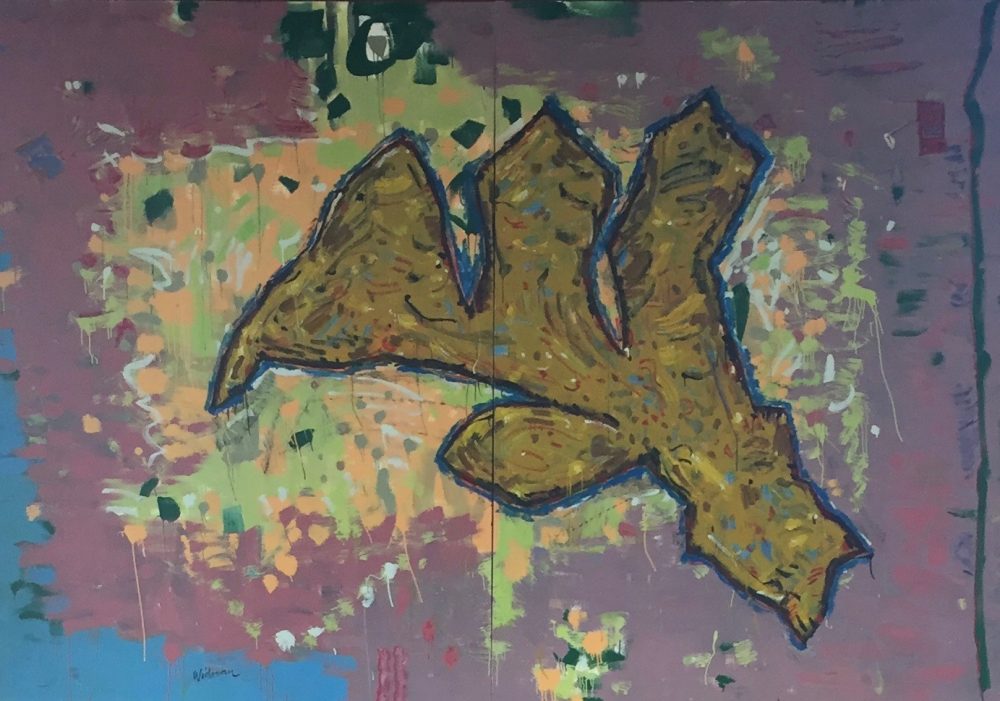 Harry Widman was often drawn to a central, abstracted shape which he called an "unknown image." He explored such images until they took on for him a significance of an archetype--  The Oracle, The Magician, The Navigator, The Dog.  When interviewed about this work in his studio in 2011, Widman talked about the importance of making a "unique, crazy, powerful" painting that would also be "puzzling." Standing in front of this painting on camera as it completely filled one wall of his studio, Widman said: "Where am I? Am I inside? Outside? What is THAT? When people look at this you want people to look at it and say 'What is that?' because then you know they really looked.  And as silly as that may sound it is true-- that works!" So call it a "dog" -- or a presence that keeps you looking.  In any case it is hard to take one's eyes off this large, shimmering mystery.  Watch Harry Widman talk about this work: https://www.youtube.com/watch?v=m8RDtH3Uxjo