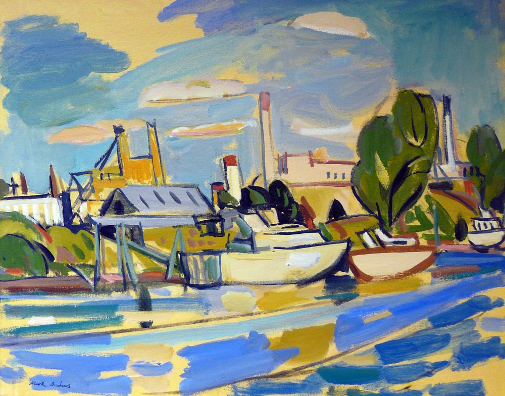 A toned ground can determine the color scheme of a painting and help unify it, as the yellow ground does in this work – more like a large colored drawing than a painting. The view is painted from under the Marquam Bridge looking towards the east industrial area just south of OMSI.