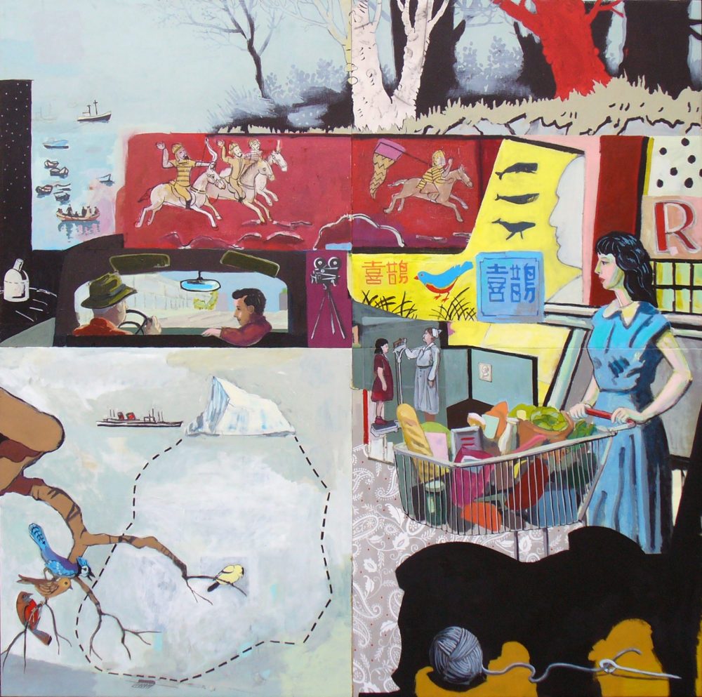 A woman pushing a shopping cart full of groceries turns a corner into a vast jumble of pictures made in the cheerful, colorful style one can still find on labels for oatmeal, hot sauce, Chinese herbs, matchbooks. Could these be labels on products the woman has in her shopping cart? If so, she pushes the whole history of the world around, as well as also what appear to be memories from the past midcentury: two men talking in a car observed from the back seat, a nurse weighing a girl on a scales, a film camera on a tripod. The poetic affinities between the images (birds, boats, fish, ships) invite us to bounce between advertisements as between personal and world histories. No conclusions are to be definitively drawn, for, as the image in the lower left implies, all this is but the tip of the iceberg. The title "You Are Still Here," might come as a reminder or reassurance that this Alice has not fallen completely down the rabbit hole, or perhaps this title is addressed to the viewer, who, like the woman in the painting, could lose themselves bouncing around in this pinball game of free association. This acrylic painting from 2012 by Chris Knight on four panels (suggestive of pocket sliding tile game) is an imposing 72x72." Playful in its imagery, it invites the viewer to play along.
