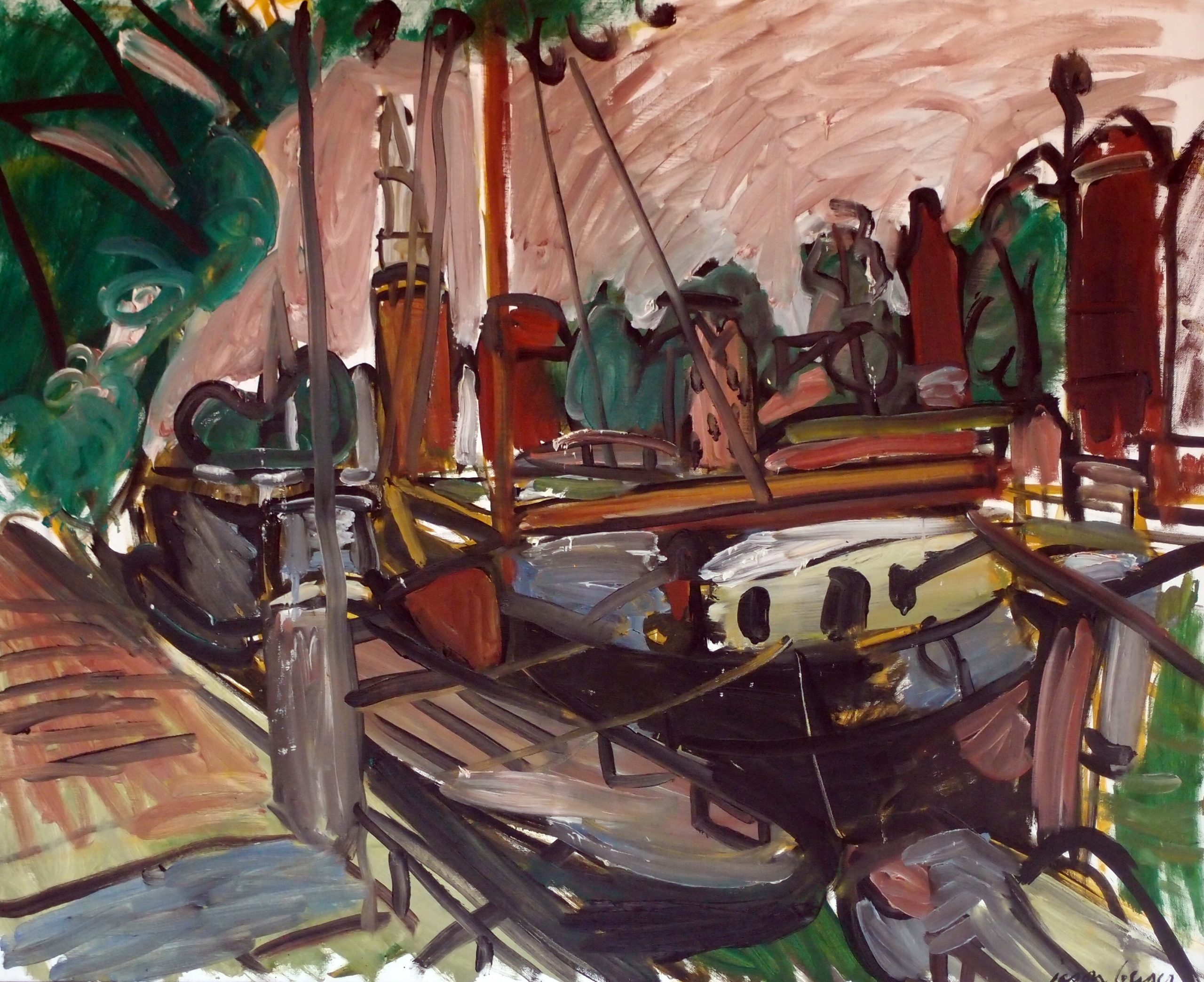 This work by Jason Berger (1924-2010) was painted in 1987 on site in Zandaam, Holland. A houseboat lies moored along the tree-lined edges of a canal with buildings in the distance under a pink sky. Up close the gestural brushwork suggests a large drawing or watercolor hastily set down in gooey blobs and sloppy washes as if the artist were working as rapidly as possible to capture a fleeting vision. Yet stepping farther back, the scene presents itself clearly and directly as a unified whole. Such seeming spontaneity was the product of numerous preliminary sketches and warm-up studies, and beneath the apparent cavalier execution lies an elegant and refined visual sensibility. Berger possessed a developed sense of pictorial structure (influenced by cubism more than impressionism) combined with a playful, often joyous, sense of improvisation. Working at the same time as the Abstract Expressionists, he frequently employed abstraction in his work, yet remained tethered to the visible world.