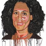 “My process is unusual: I work from an image using no plans or sketches, and mix the yarns knot by knot, building tiers of color like brushstrokes to define my subjects. With each portrait I always begin with the eyes, using the rows of stitches like lines to define the facial structure, working outward until the person is captured in my knots. The subjects are created from and contained within the handmade fabric, and the knots suggest units of time and reveal the physical process.”