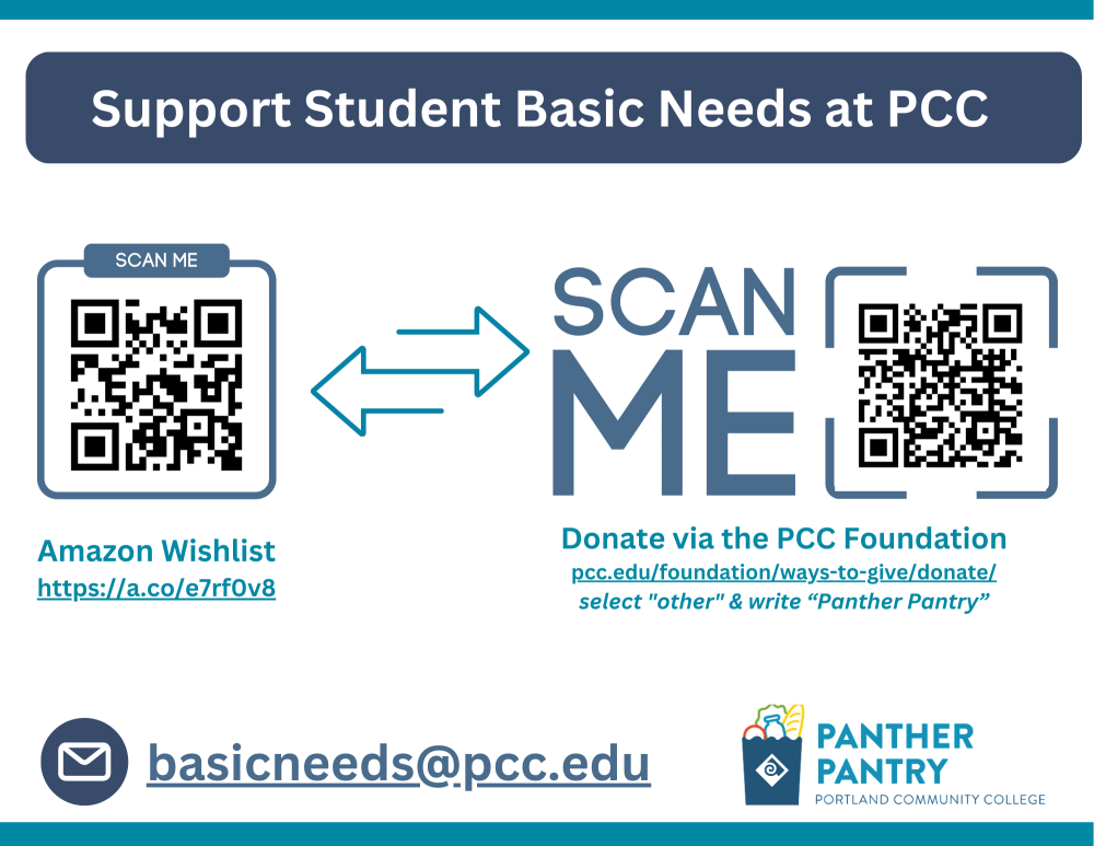 Your monetary donations make a huge impact because we can purchase items in bulk and for pennies on the dollar through our partnership with the Oregon Food Bank. To help keep our shelves stocked, please consider donating funds through the PCC Foundation using the link below (be sure to designate your gift for the Panther Pantry).