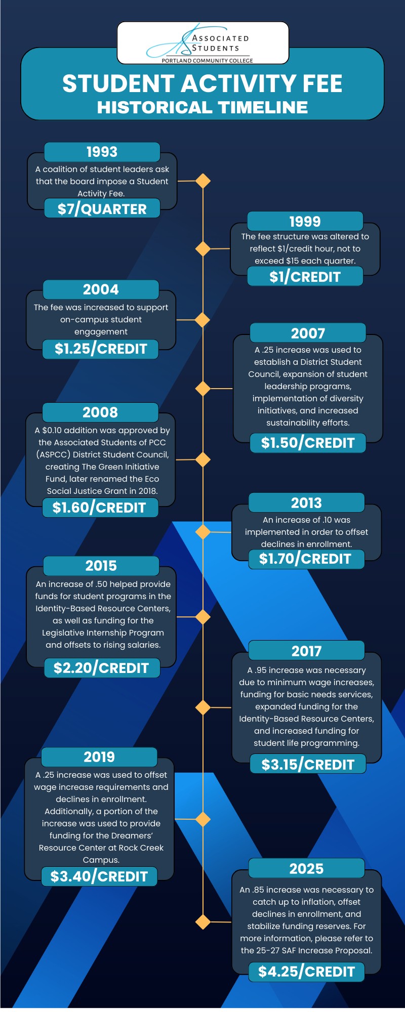 The student activity fee was last increased in 2018 from $3.15 to $3.40 ($0.25, 7.9%), and before that in 2017 from $2.20 to $3.15 ($0.95, 43.2%). An $0.85 (25%) increase to the Fee has been approved by the PCC Board of Directors, which will raise it to $4.25 for the 2025-27 Biennium. This increase will benefit PCC students by allowing Fee-funded programs to utilize their full budgets and maintain current service levels, as well as aligning the Fee with purchasing power equivalent to 2018, when the Fee was last increased.