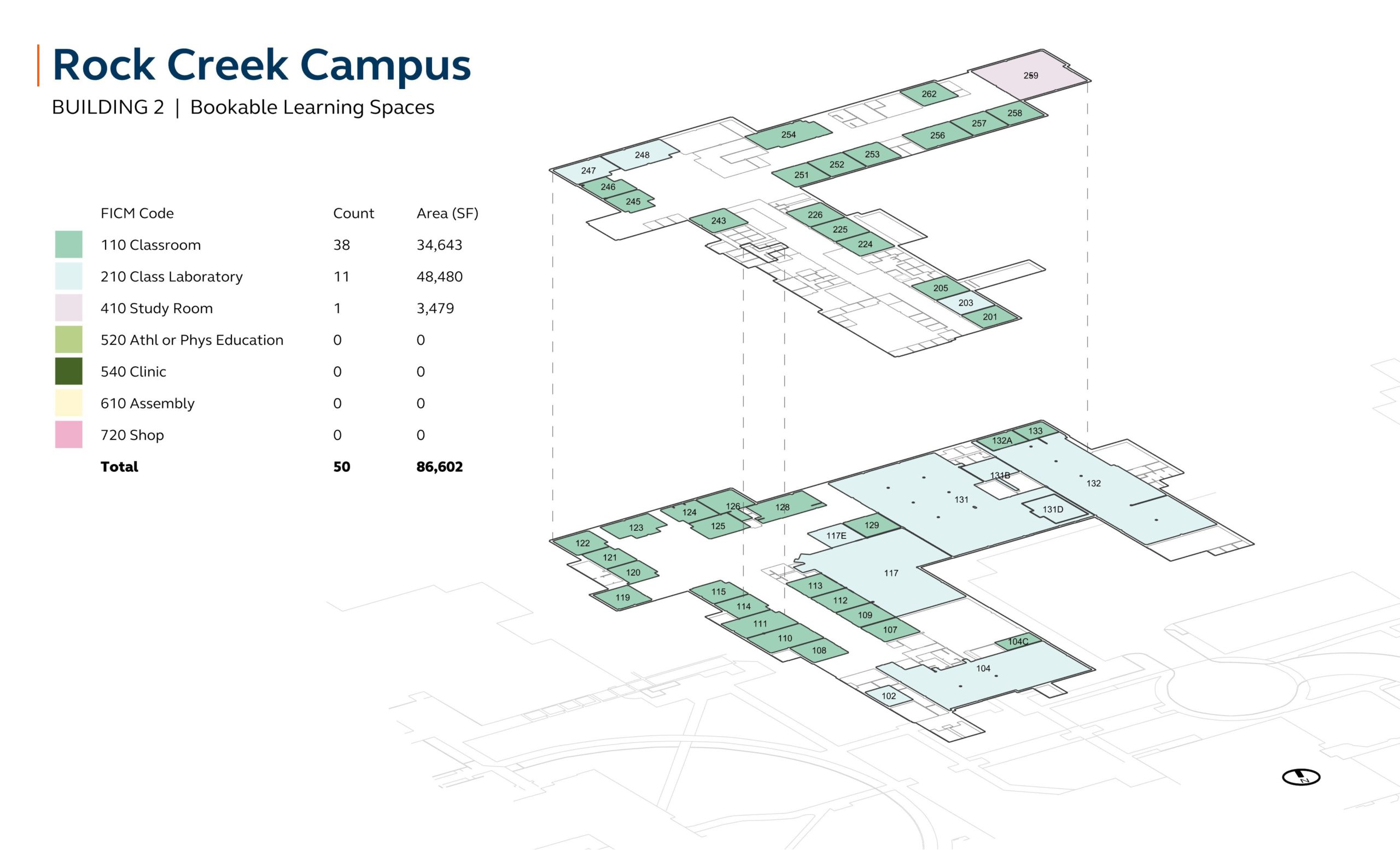 This diagram illustrates the bookable learning spaces identified in Rock Creek Campus Building 2, shown in color. Not all spaces in a building can host scheduled classes (e.g., hallways, restrooms, cafeterias); spaces not shown in color represent administrative, operational, or student support areas and are not considered bookable learning spaces.
