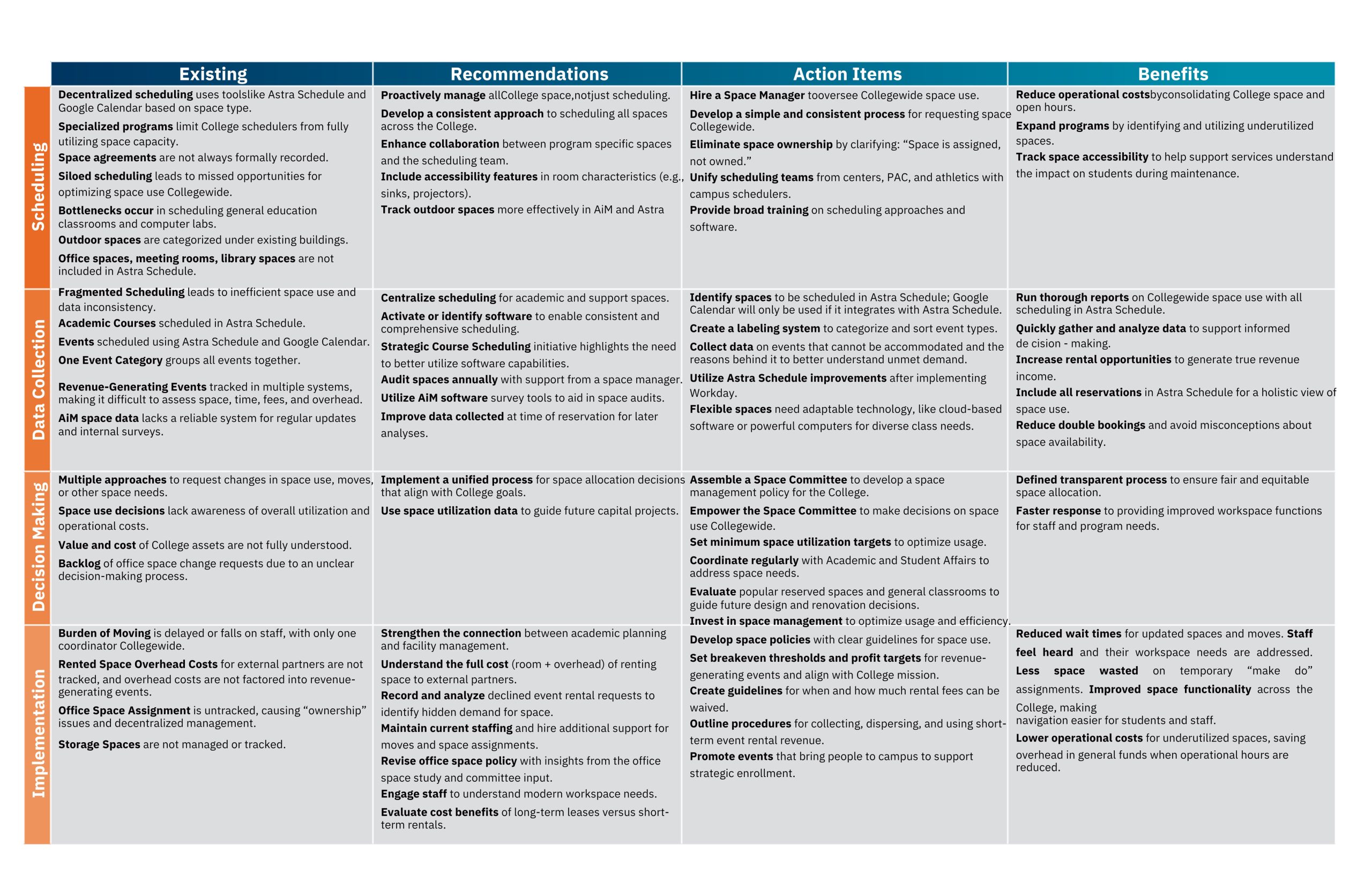 - Investment in space management infrastructure: Hire a Space Manager to oversee collegewide space use and ensure consistent management practices.