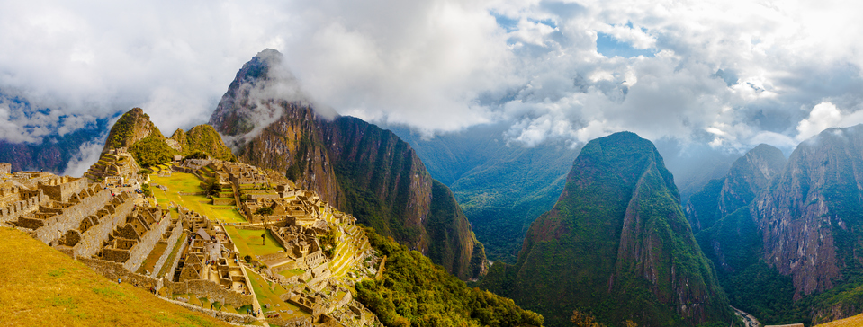High panoramic view of Machu Picchu, Huayna Picchu (Wayna Picchu) and the Sacred Valley (Urubamba Valley). Located on the Inca Trail in the Andes Mountains in Peru.