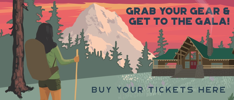Grab your gear and get to the Gala! Buy your tickets here. Illustration of a Native American woman hiking to the lodge