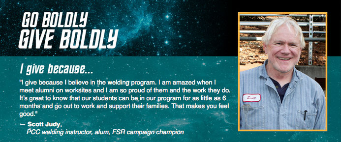 I give because… ‘I give because I believe in the welding program. I am amazed when I meet alumni on worksites and I am so proud of them and the work they do. It’s great to know that our students can be in our program for as little as 6 months and go out to work and support their families. That makes you feel good.’ Scott Judy, PCC welding instructor, alum, FSR campaign champion