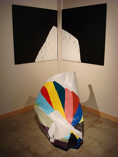 Top: The Crone, Paint and vinyl tape on wood panel; Bottom: The Child, Paint and rubber in urethane plastic