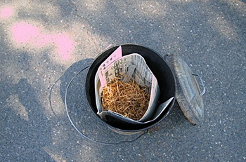 Lidded containers are prepared with combustible materials such as newspaper, pine needles, leaves, etc.