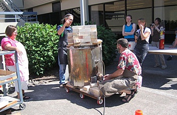 Through a “stoking hole”, wood that has been soaked in salt water and dried is stoked every few minutes after approximately 2000 degrees Fahrenheit is reached.